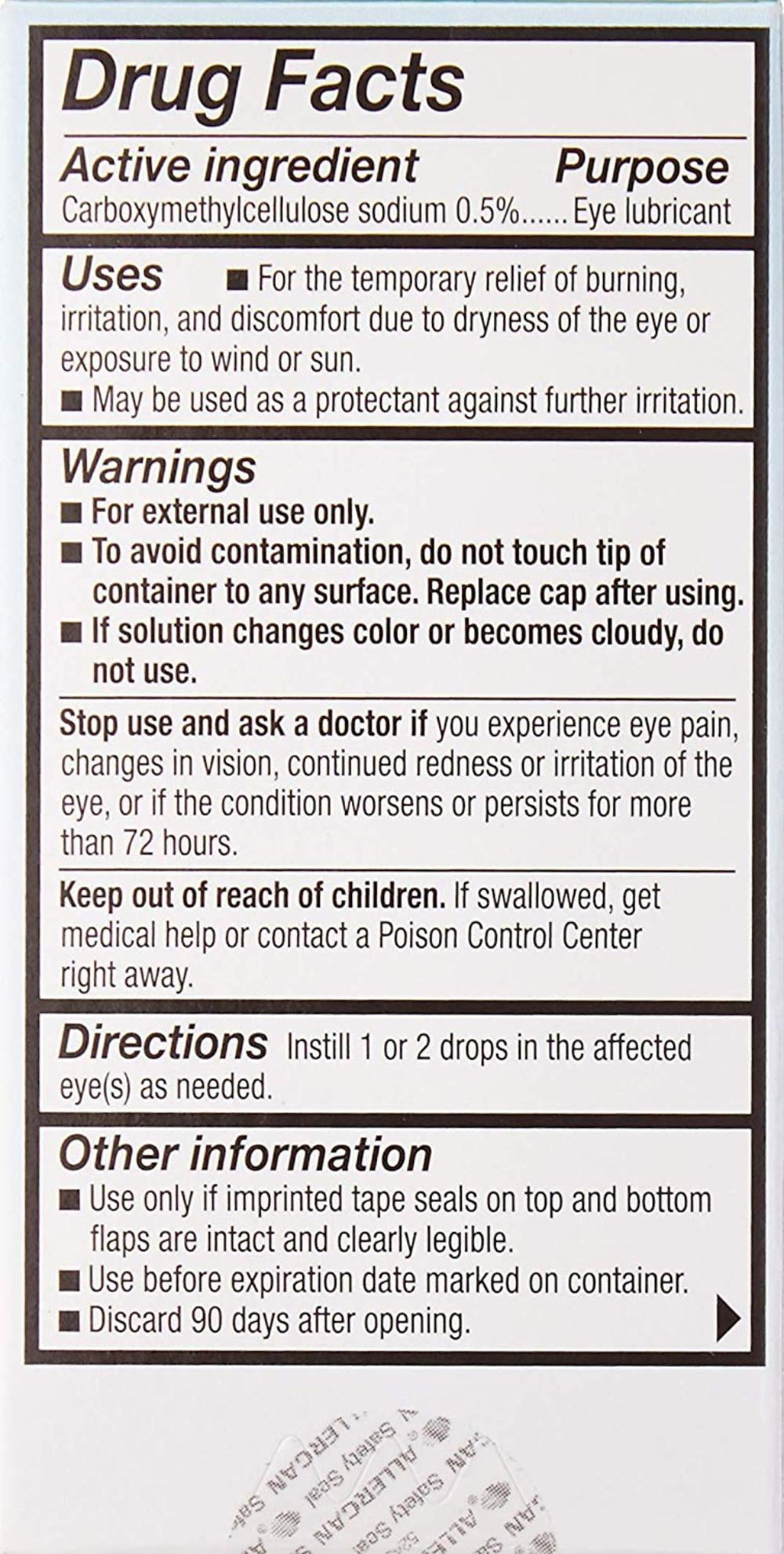 N/AThe easy answer for dry eye relief. Active Ingredients: Sterile, Isotonic, Buffered, and Preserved Solution Containing: Carboxymethylcellulose Sodium; Sodium Chloride; Boric Acid; Sodium Borate Decahydrate; Potassium Chloride; Calcium Chloride; Magnesium Chloride; Purified Water; Preserved With PURITE (Stabilized Oxychloro Complex); May Also Contain: Hydrochloric Acid and/or Sodium Hydroxide to Adjust pH Uses: Instantly moisturizes and soothes dry eyes caused by soft and rigid gas permeable contact lens wear. Utilizing a unique, long-lasting lubricant, every application creates a liquid cushion that comforts and protects. For use with soft and RGP contact lenses. This preparation contains no chlorhexidine, no thimerosal, and no other mercury-containing ingredients.