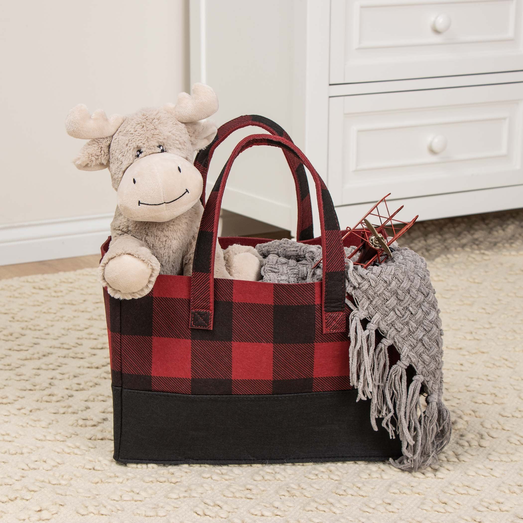 The Sammy & Lou Buffalo Check Felt Essential Storage Tote is ideal for keeping all of your toys, clothes and other necessities organized. Keep clutter out of sight with this sturdy yet collapsible felt storage tote. The two-toned tote features a red and black buffalo check print on top with a classic solid black bottom panel. Handles allow easy transport. Coordinating accessories and room décor by Sammy and Lou are available and sold separately.