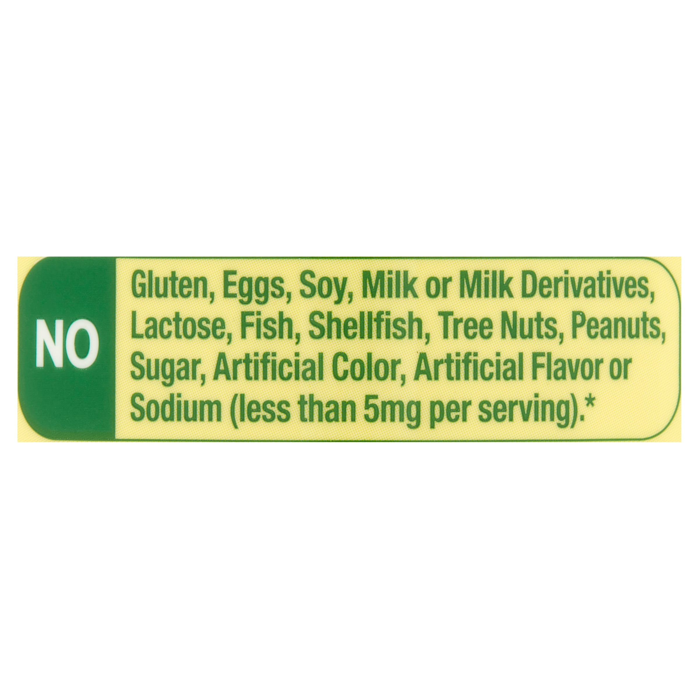 - No gluten, eggs, soy, milk or milk derivatives, lactose, fish, shellfish, tree nuts, peanuts, sugar, artificial color, or artificial flavor