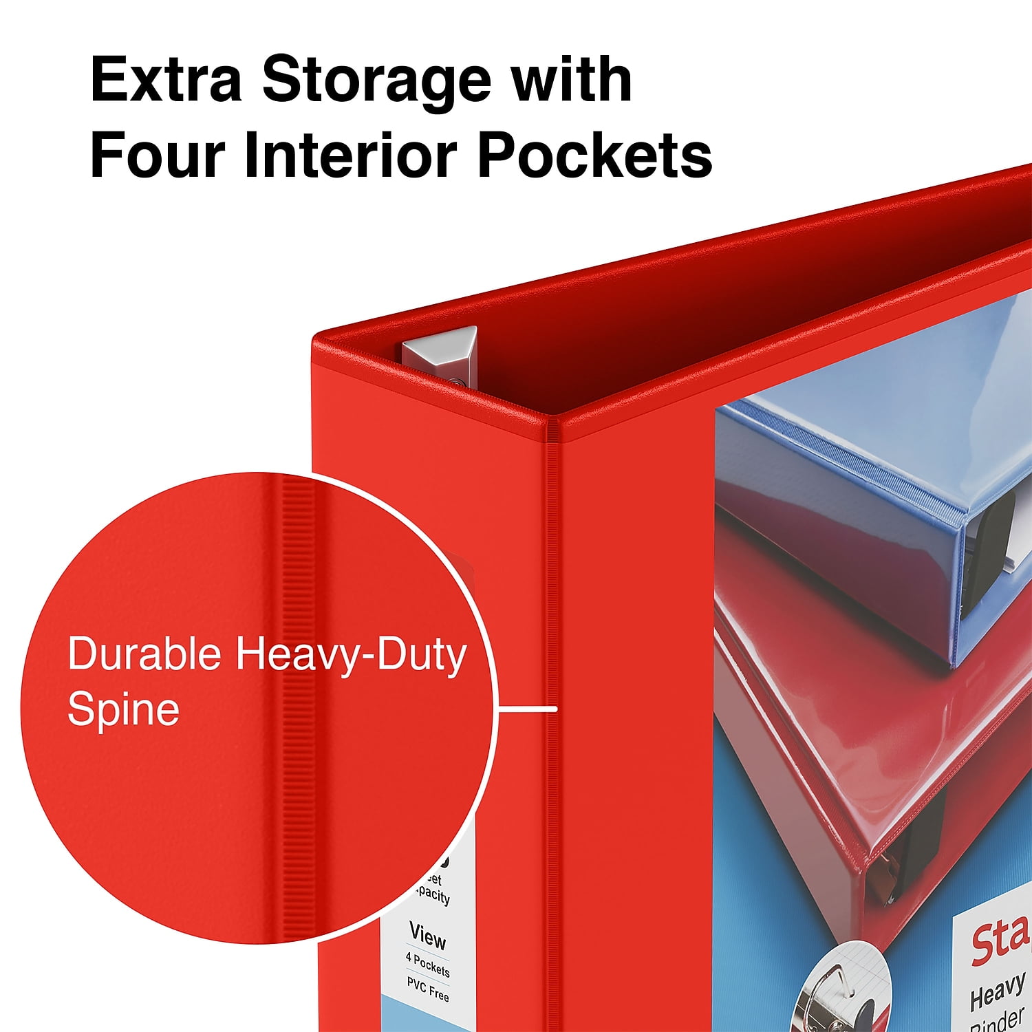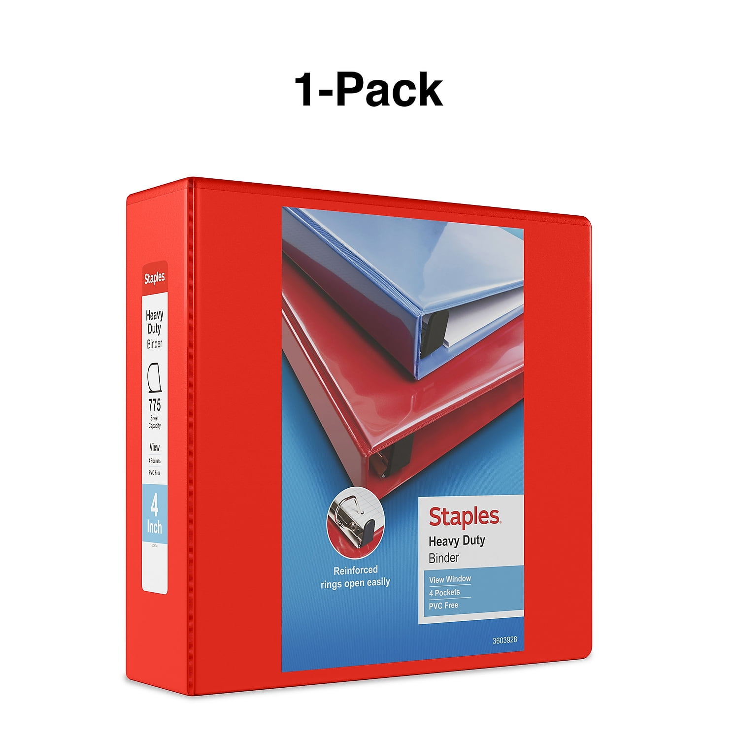 Compile paperwork in this Staples heavy duty 4-inch D-ring view red binder.File frequently referenced paperwork in this red view binder. A clear overlay provides space for a label or title page, and the red color helps this binder stand out. The back-mounted D-rings keep paper flat for easy document viewing and close securely to prevent paper from falling out. With four interior pockets, this Staples heavy duty view binder offers extra storage for notepads, loose paper and other small items. Red heavy duty view binder is an excellent way to store spreadsheets and other papers. 4 inch binder. Three D-rings keep pages secure. Easy Locking Rings open with ease and keep pages secure. Holds up to 775 sheets. Durable covers are made of plastic with nonstick surface. Four interior pockets for added organization. Insert a custom spine label for easy identification. Accommodates 8.5"" x 11"" letter-sized papers. PVC free – made from plastics using fewer harmful chemicals and with reduced emissions during manufacturing. Sold as 1 Each.