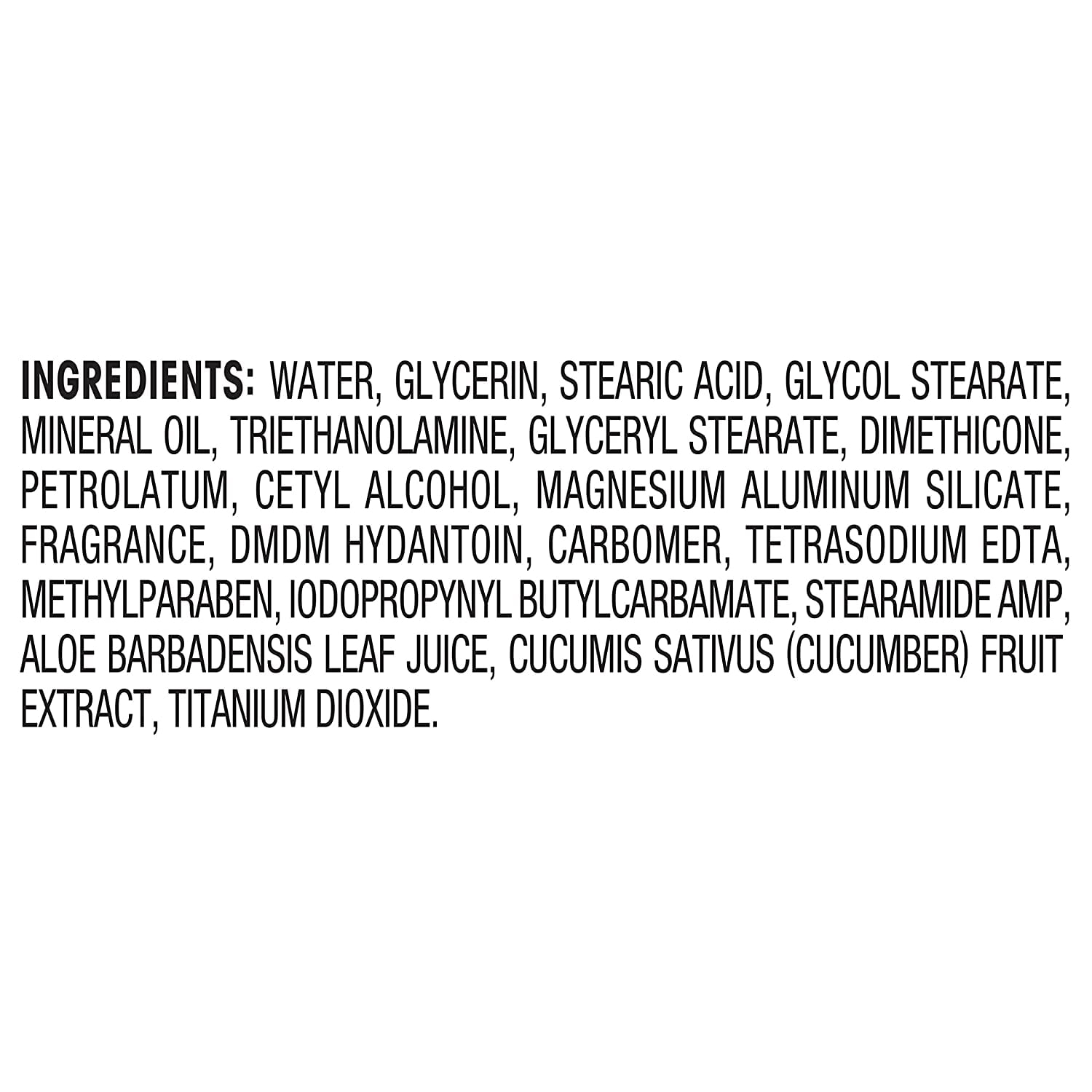 Say yes to beautiful. Active Ingredients: Water; Glycerin; Stearic Acid; Mineral Oil; Glycol Stearate; Aloe Barbadensis (Aloe Vera) Leaf Juice; Cucumis Sativus (Cucumber) Extract; Citrus Aurantium Dulcis (Orange) Oil; Glyceryl Stearate; Cetyl Alcohol; Petrolatum; Fragrance; Dimethicone; StearamideAMP; Magnesium Aluminum Silicate; Triethanolamine; Carbomer; Methylparaben; Tetrasodium EDTA; DMDM Hydantoin; Titanium Dioxide (CI 77891) Uses: This light moisturizer with natural aloe and cucumber soothes dry skin, especially after exposure to sun. And, it absorbs quickly & easily, leaving skin feeling smooth and refreshed. Clinically-proven moisturization.