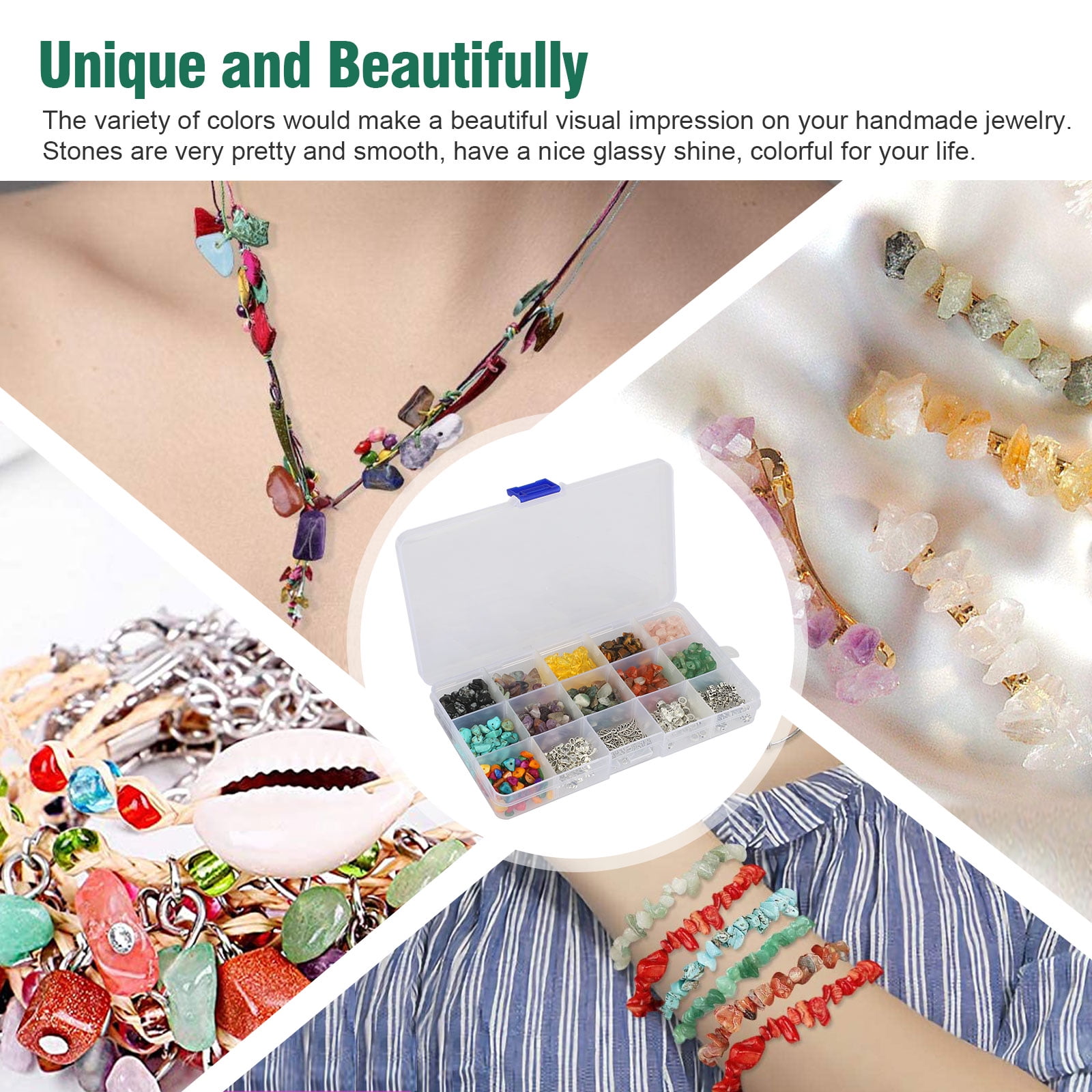 TSV natural colored irregular chips stone beads come in 11 colors and each color has 50 pieces. The pendant comes in 3 different shapes, leaf, bow, and shamrock. Then the bracelet spacer beads come in 2 types, round, and flower, to satisfy your different demands. The variety of colors would make a beautiful visual impression on your handmade jewelry. Stones are very pretty and smooth, have a nice glassy shine, colorful for your life. The sizes of natural stone chips are irregular which will help you make some very distinctive jewelry. These irregular gem beads are very suitable for home decoration, collection, and beads associated. Jewelry making kit is great for DIY bracelets, necklaces, anklets, earrings, brooches, rings, pendants, and making other crafts.