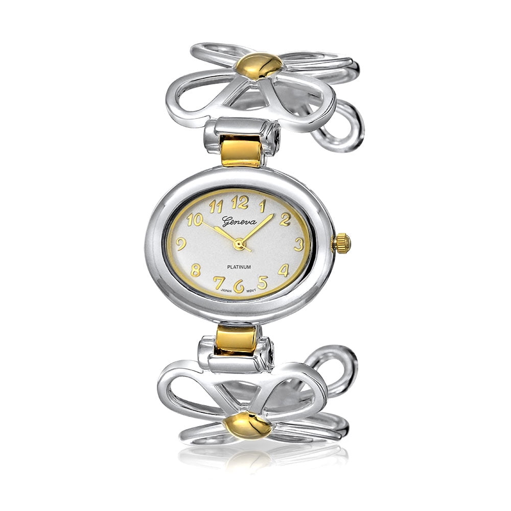 Two Tone Daisy Flower Band White Oval Dial Cuff Watch Gold Plated
