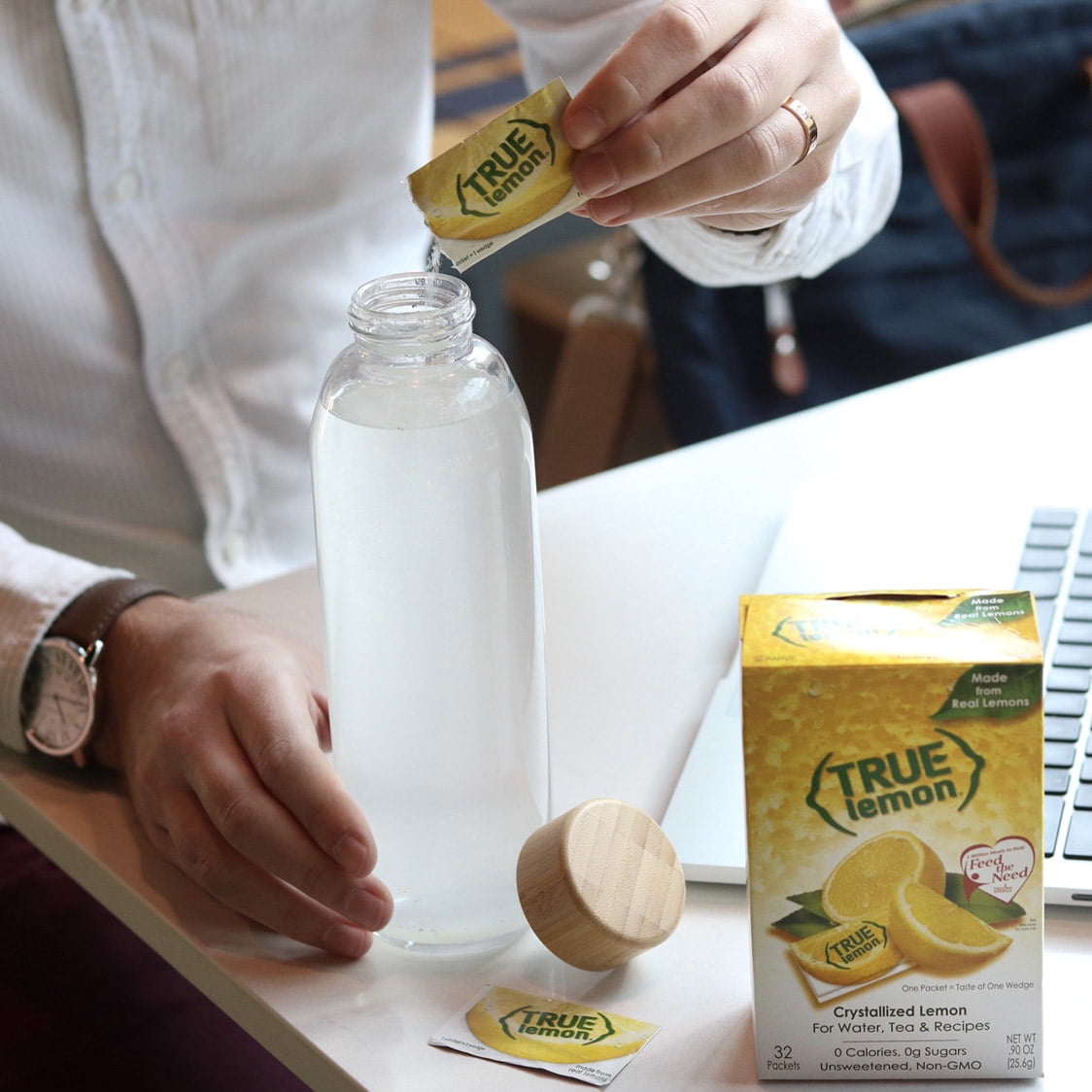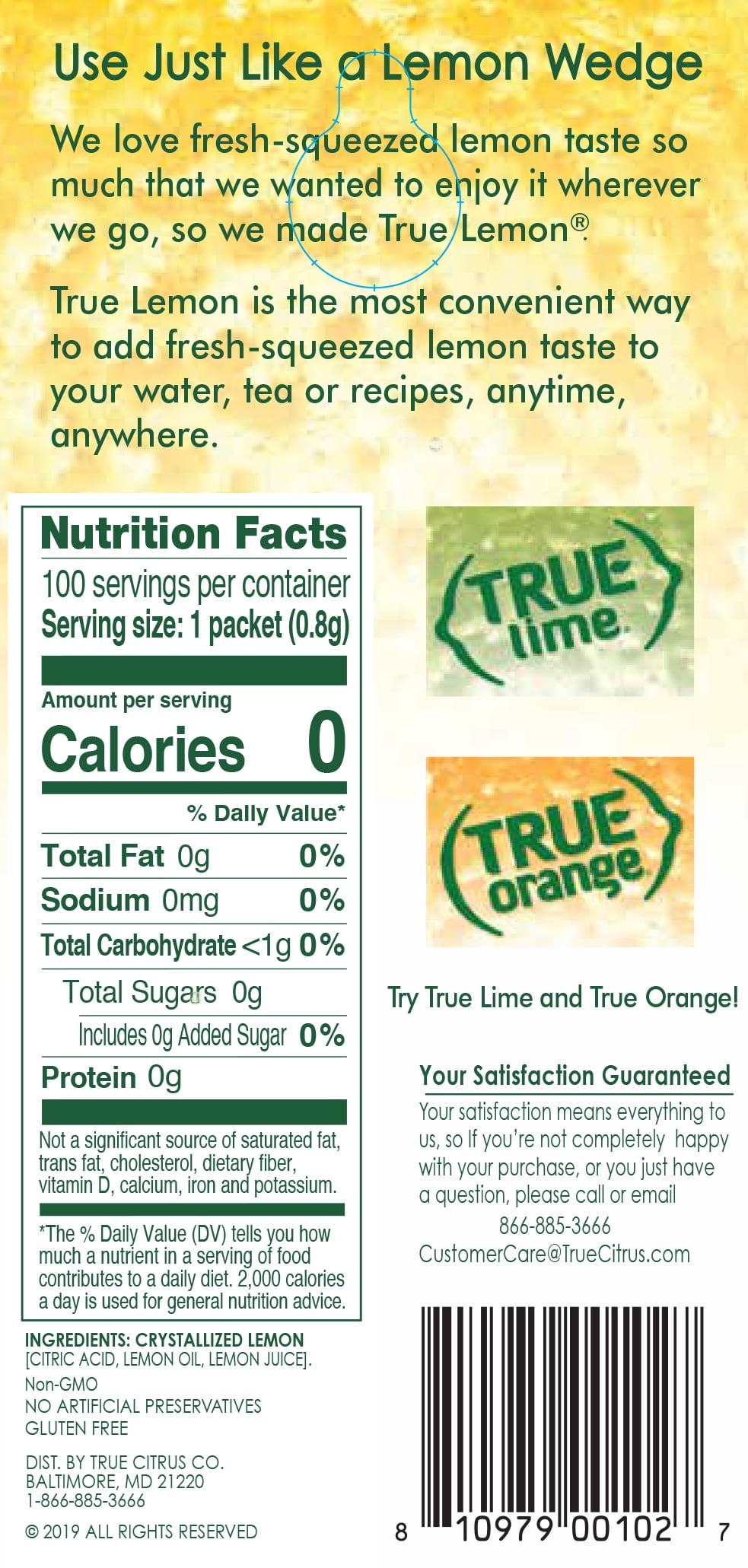 Enjoy the taste of fresh squeezed lemon wherever you go with True Lemon. Made from real lemon juice and oils, this crystallized wedge replacement can be used to enhance the flavor of water, tea, and recipes. Each 0 calorie True Lemon crystallized packet equals the taste of one lemon wedge, contains no artificial sweeteners or preservatives, is non-GMO and made with only three ingredients. It’s also great for seasoning and recipes that call for lemon juice!
