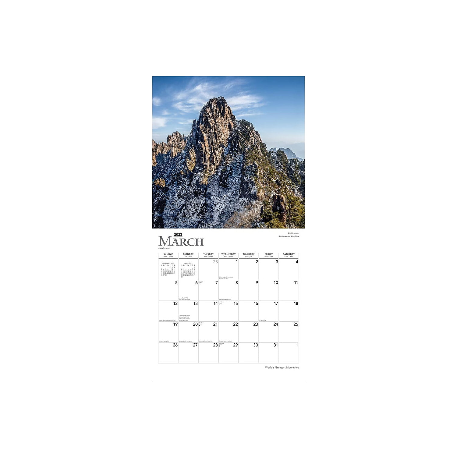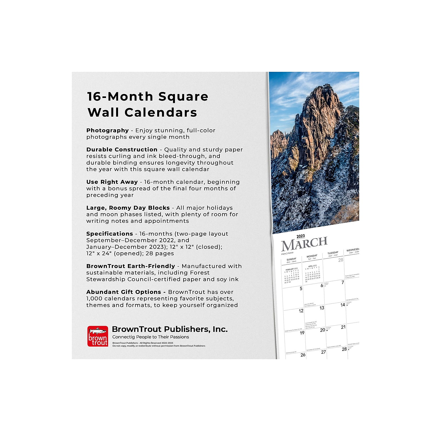 - Photography – Enjoy stunning, full-color photographs every single month. Specifications – 16-months (two-page layout September–December 2022, and January–December 2023); 12"" x 12"" (closed); 12"" x 24"" (opened); 28 pages. Not a Dry Erase Calendar. World’s Greatest Mountains.