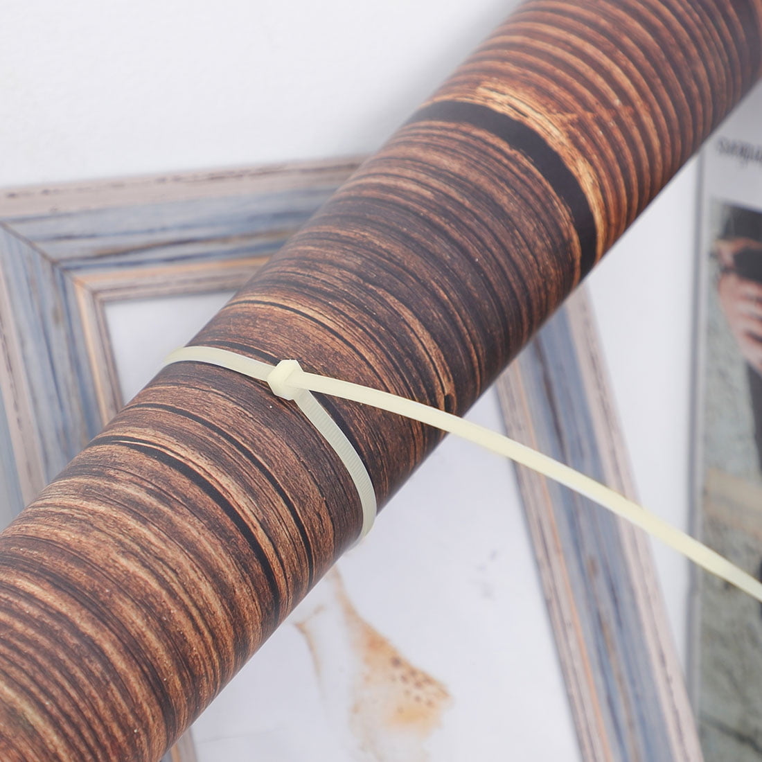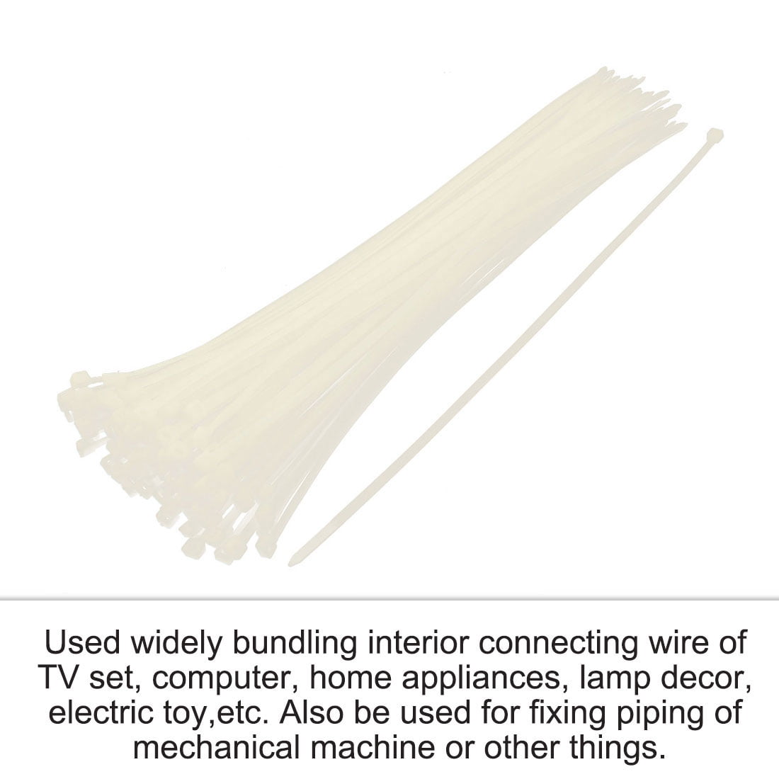 Made of durable plastic material, the self-locking wires wrap features beige white color, 19" length and 0.2" width. Consisted of a toothed strip with a one-way ratcheting hole at one end. You slide the pointed end into the hole and pull it tight, but it will not loosen up. Used widely bundling interior connecting wire of TV set, computer, home appliances, lamp decor, electric toy,etc. Also be used for fixing piping of mechanical machine or other things. Place around what you want to cinch just like a normal tie, then pull tight by hand. Package includes 97 pieces cable wrap.