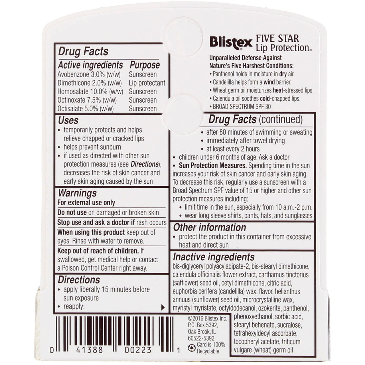 DetailsUnparalleled Defense Against Nature’s Five Harshest Conditions: Panthenol holds in moisture in dry air. Candelilla helps form a wind barrier.Wheat germ oil moisturizes heat-stressed lips. Calendula oil soothes cold-chapped lips. BROAD SPECTRUM SPF 30. Uses: Temporarily protects and helps relieve chapped or cracked lips. Helps prevent sunburn. If used as directed with other sun protection measures (see Directions), decreases the risk of skin cancer and early skin aging caused by the sun. DirectionsApply liberally 15 minutes before sun exposure.Reapply: after 80 minutes of swimming or sweatingimmediately after towel dryingat least every 6 hoursChildren under six months of age: ask a doctor.Other Information: Protect this product from excessive heat and direct sun. Sun Protection Measures: Spending time in the sun increases your risk of skin cancer and early skin aging. To decrease this risk, regularly use a sunscreen with Broad Spectrum SPF value of 15 or higher and other sun protection measures including: limit time in the sun, especially from 10 a.m.-2 p.m.wear long sleeve shirts, pants, hats and sunglassesWARNINGS:For external use only. Do not use on damaged or broken skin. Stop use and ask a doctor if rash occurs. When using this product, keep out of eyes. Rinse with water to remove. Keep out of reach of children. If swallowed, get medical help or contact a Poison Control Center right away.