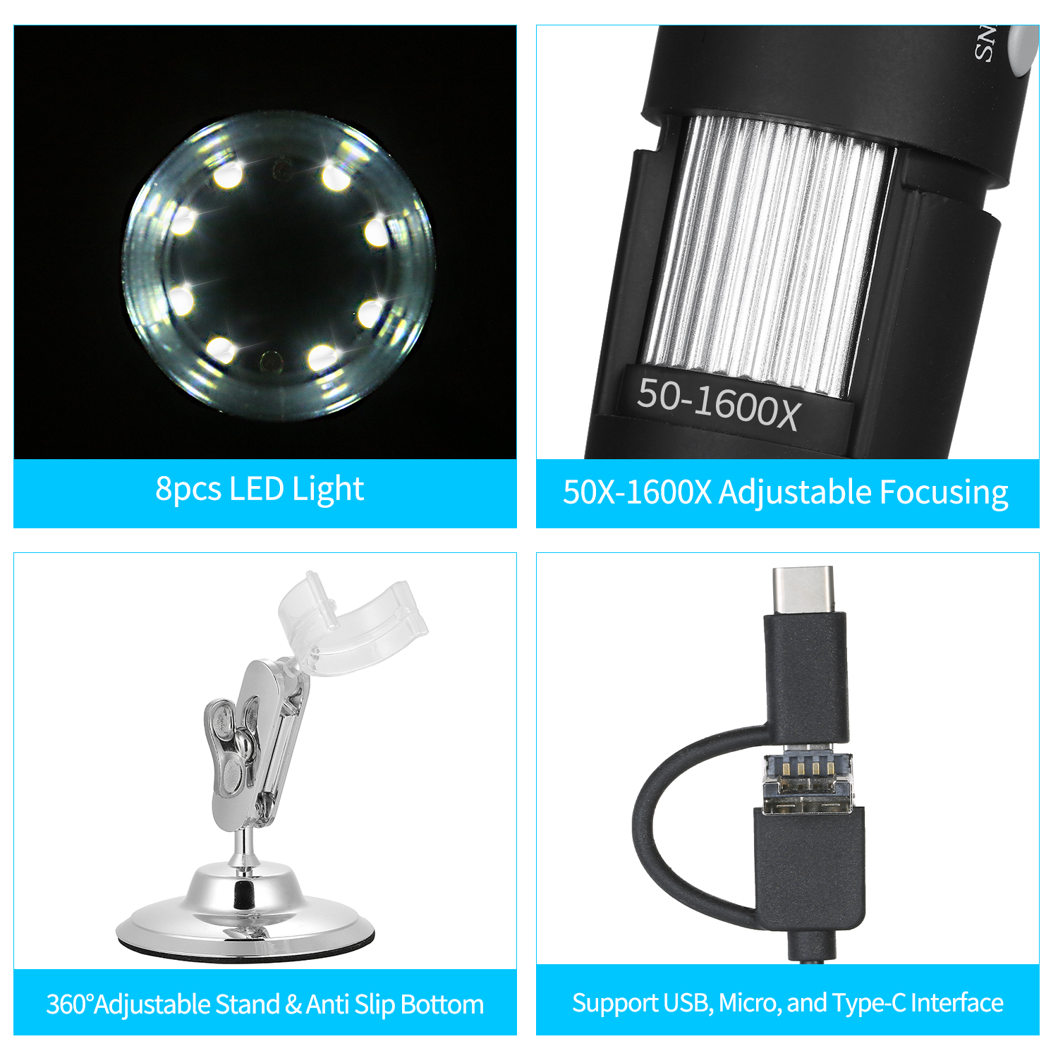 Built-in 8 LED lights and the brightness is adjustable. Adjustable 360° stand is great for hands-free operation and multi-angle observation.
