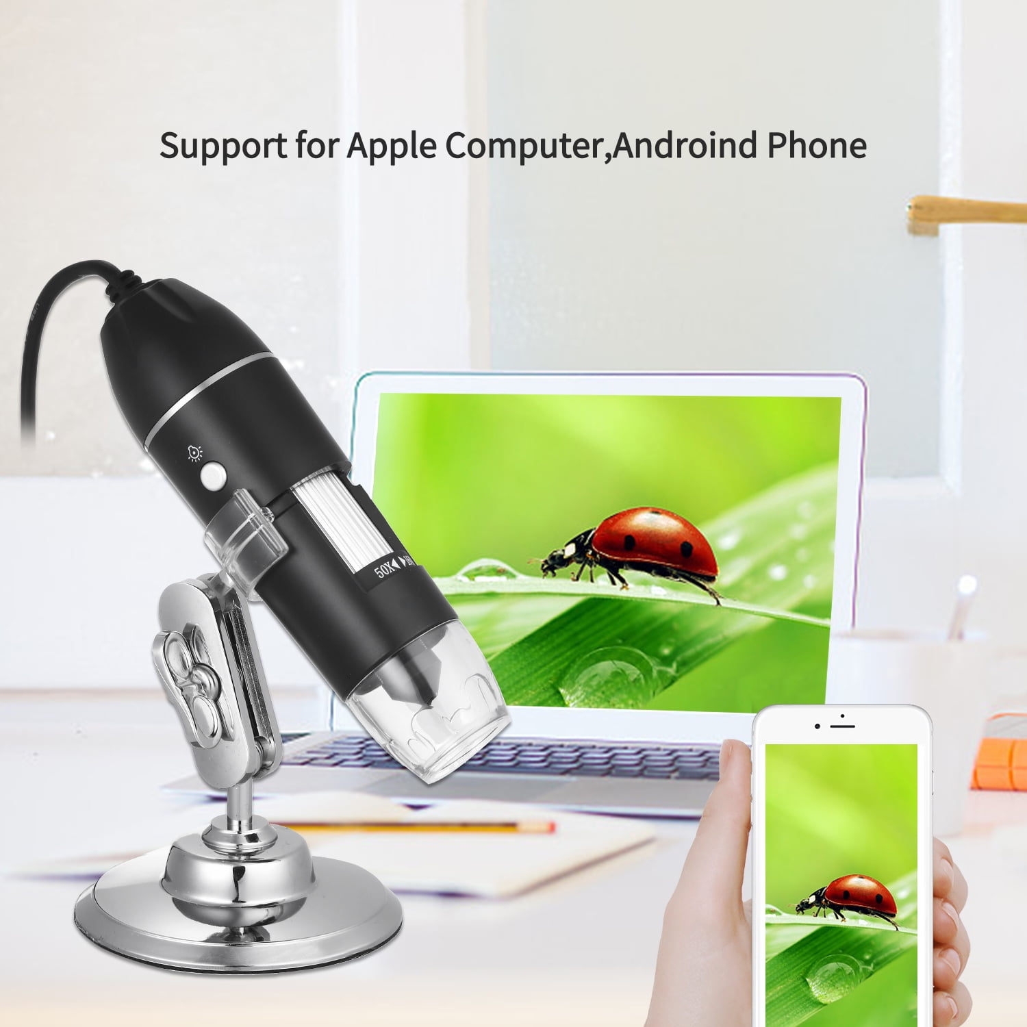 - The microscope can be connected with your computer or mobile phone via the USB port, micro USB or type-c port, convenient to use on OTG Android device, tablet, Windows, compatible with , no need for extra adapter.(Not compatible with /)