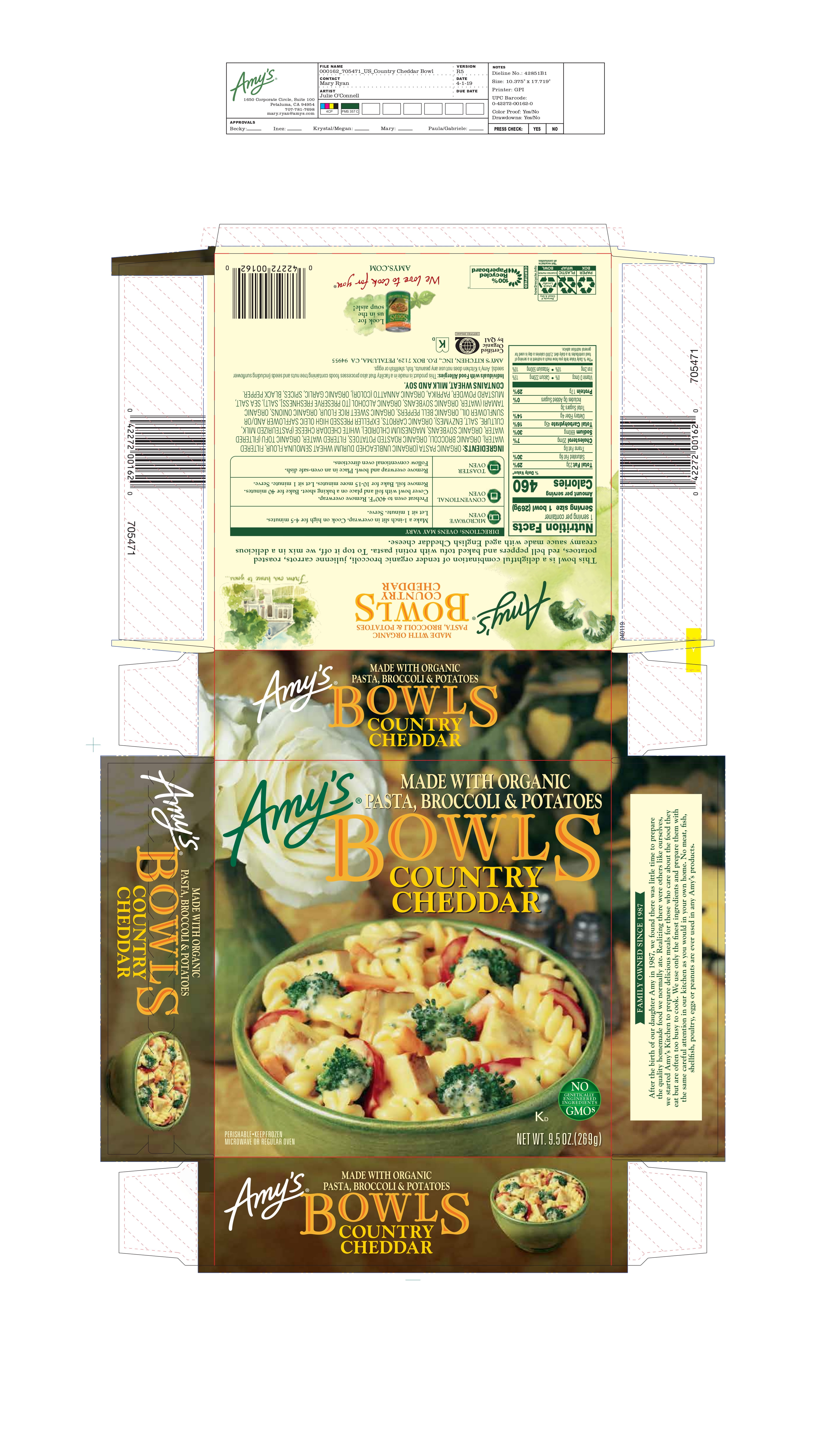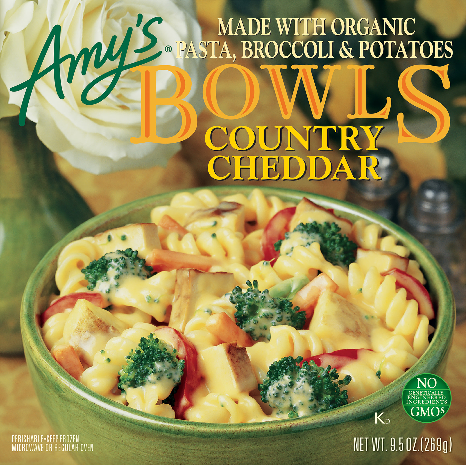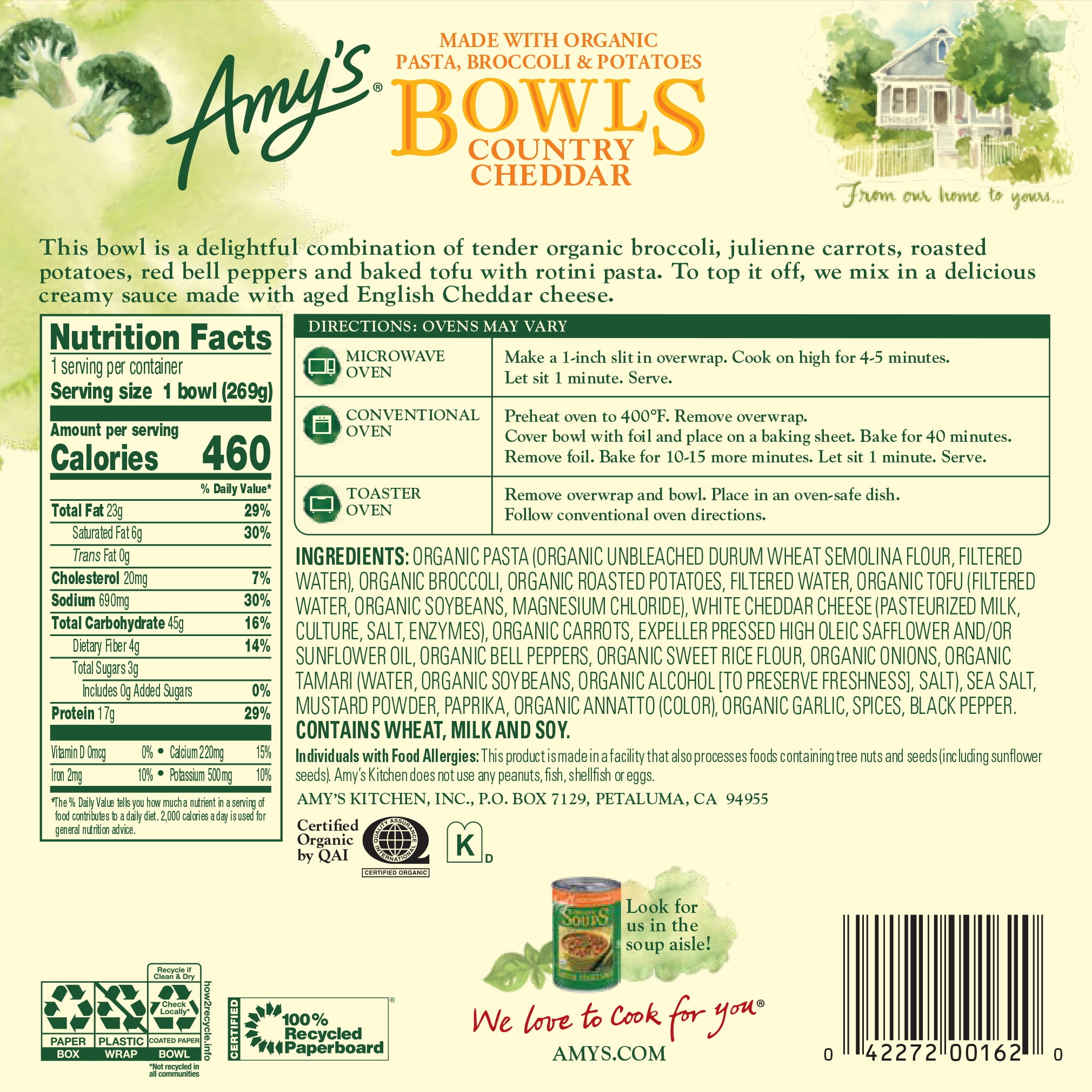 Amy’s Country Cheddar Bowl is a delightful mix of organic rotini pasta in our delectable cheese sauce, made with real Cheddar cheese from southwest England. Also tossed in with it are organic vegetables and organic, made-from-scratch, baked tofu. Convenient and easy to prepare, this is surely something the whole family can enjoy. Amy’s Country Cheddar Bowl contains wheat, milk and soy, non GMO ingredients and is suitable for kosher diets.At Amy?s Kitchen goodness is our guiding principle. Since 1987, we at Amy?s Kitchen produce delicious, organic convenient foods for people who are sometimes too busy to cook. Amy?s is a family-run business, and we supervise every aspect of our business and take pride in customer satisfaction. All the fruits, vegetables and grains we use are grown without the use of insecticides, GMOs and other harmful chemicals. We prepare these ingredients with the same careful attention in our kitchen as you would in your own home for high-quality, home-style vegetarian and vegan meals. No meat, fish, shellfish, poultry, eggs or peanuts are ever used in any Amy’s products. Even though you’re heating up our meals in your home, we want each bite to taste like you’re a guest in ours.