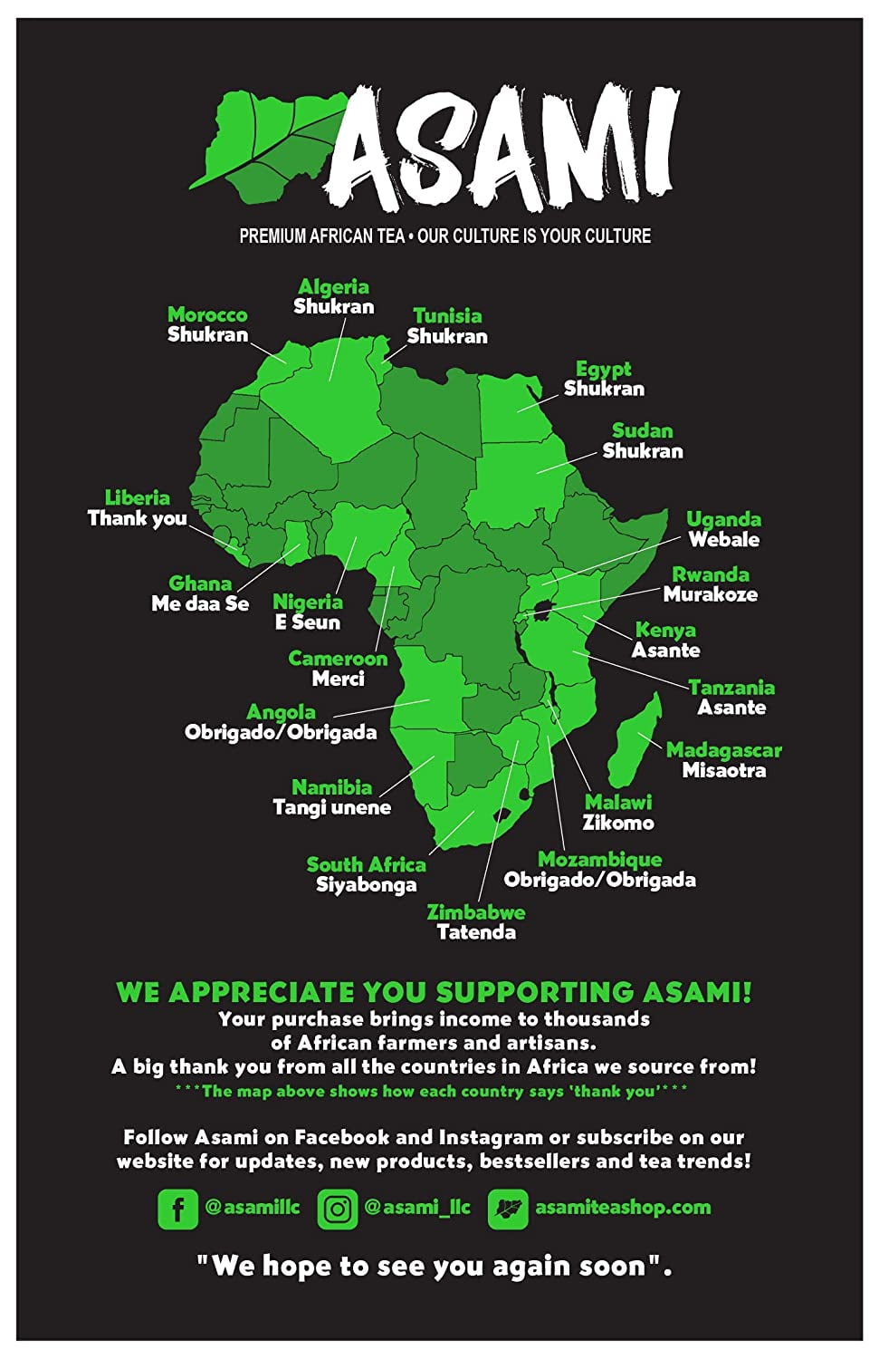 OUR STORY: Asami "African Culture" is inspired by gourmet organic natural tea products based on African roots that are nutritious, detox, better-for-you and support good health. Our products are heritage-based, unique and authentic stirred by shared cultural traditions from Africa. The refreshing brew will transport you to notable places in the continent of Africa. Growing up in West Africa, tea was a staple in our diet and celebrations.