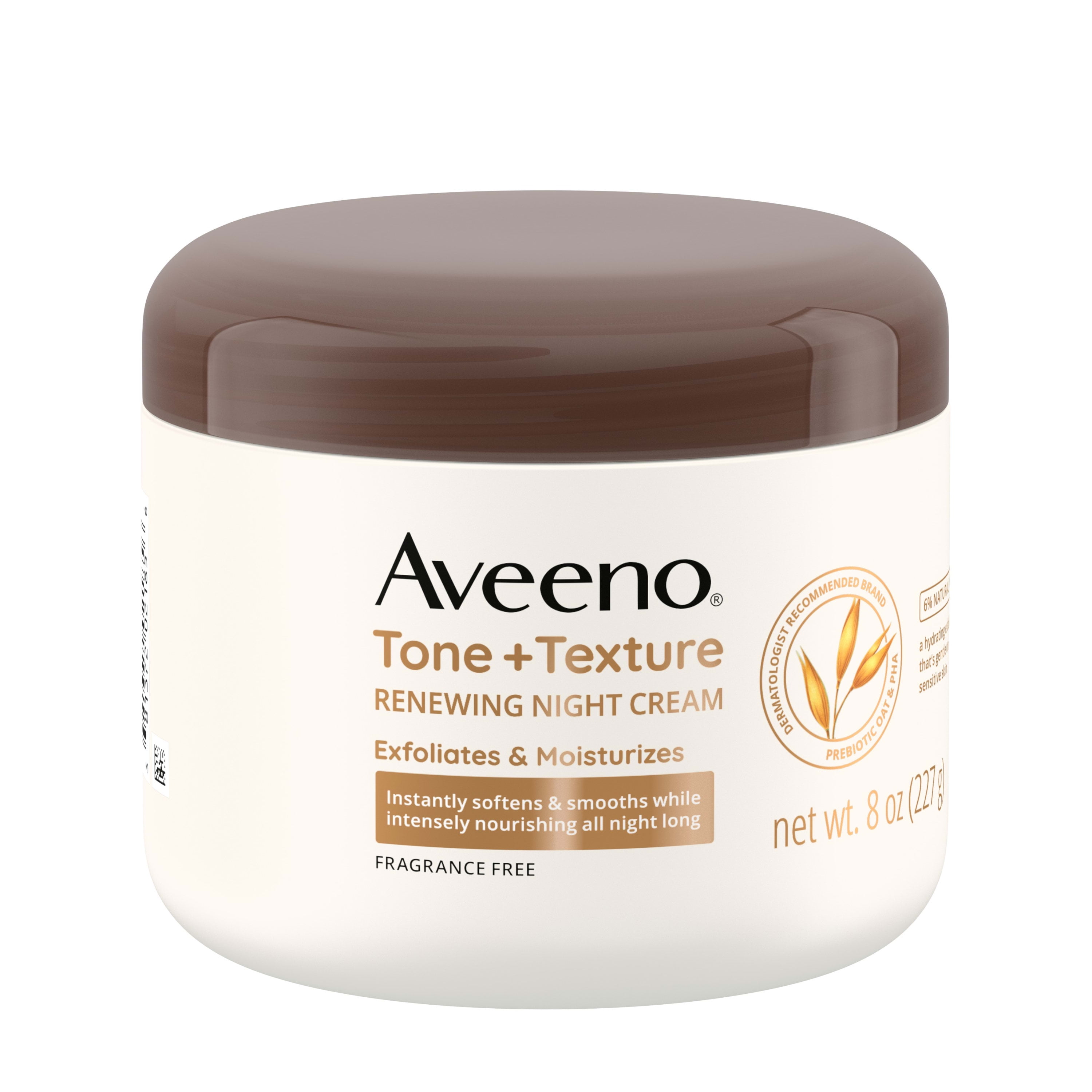 Instantly soften and smooth skin while nourishing all night long with Aveeno Tone + Texture Renewing Night Cream with prebiotic oat. Designed to gently exfoliate and moisturize sensitive skin as you sleep, the nourishing renewing cream from a dermatologist-recommended brand hydrates sensitive skin while gently resurfacing to visibly improve bumpy skin (including KP), roughness, discoloration, and uneven skin tone. In fact, with just one use, skin is noticeably softer and smoother. The exfoliating cream is formulated with 6% natural PHA, Pro-Vitamin B3, and prebiotic oat, and has a non-greasy, non-comedogenic, and fast-absorbing formula. A great addition to your nightly skin care routine, the exfoliating cream evens skin tone, is fragrance-, paraben-, and dye-free. Apply the night body cream as desired to clean skin to nourish skin while gently exfoliating while you sleep.