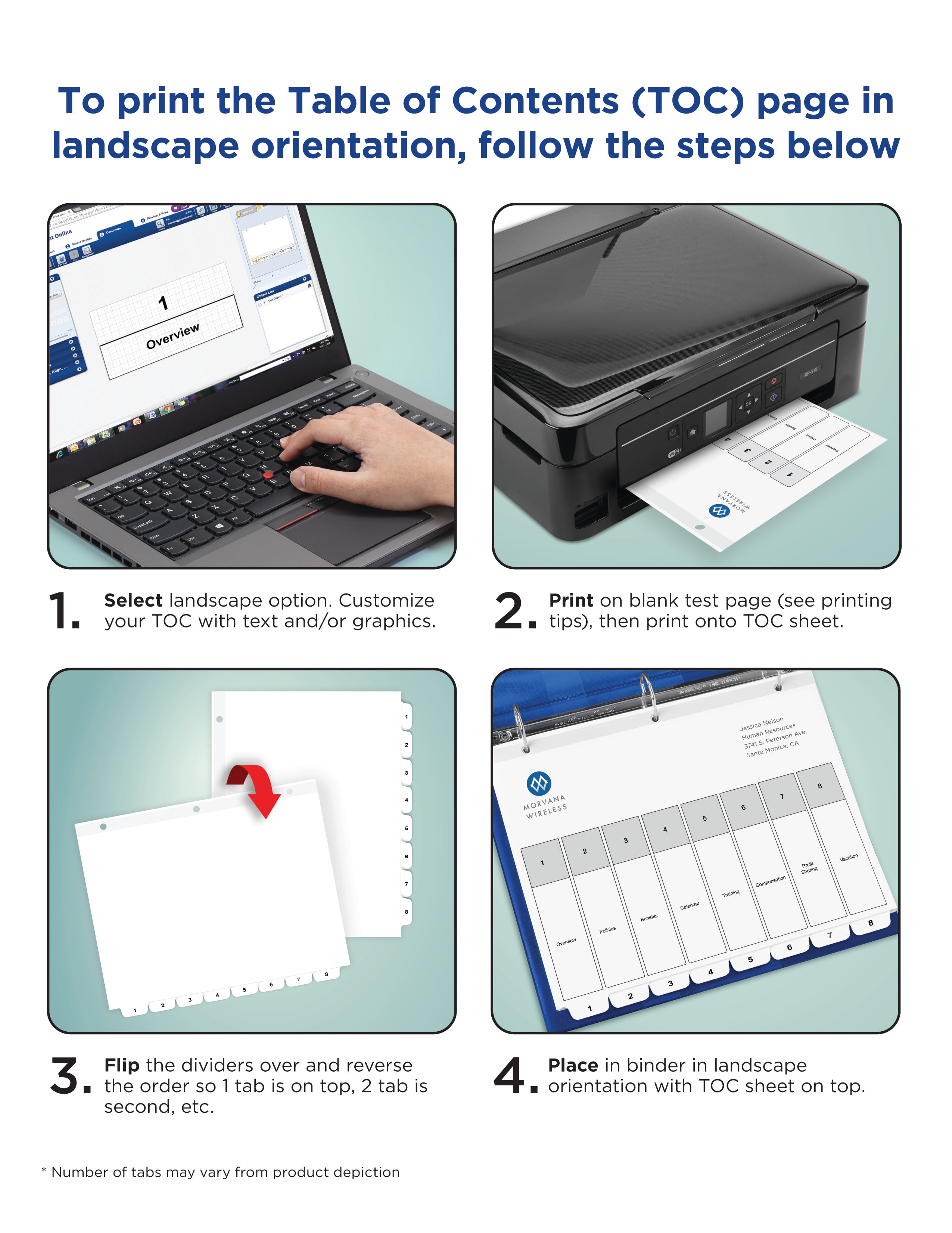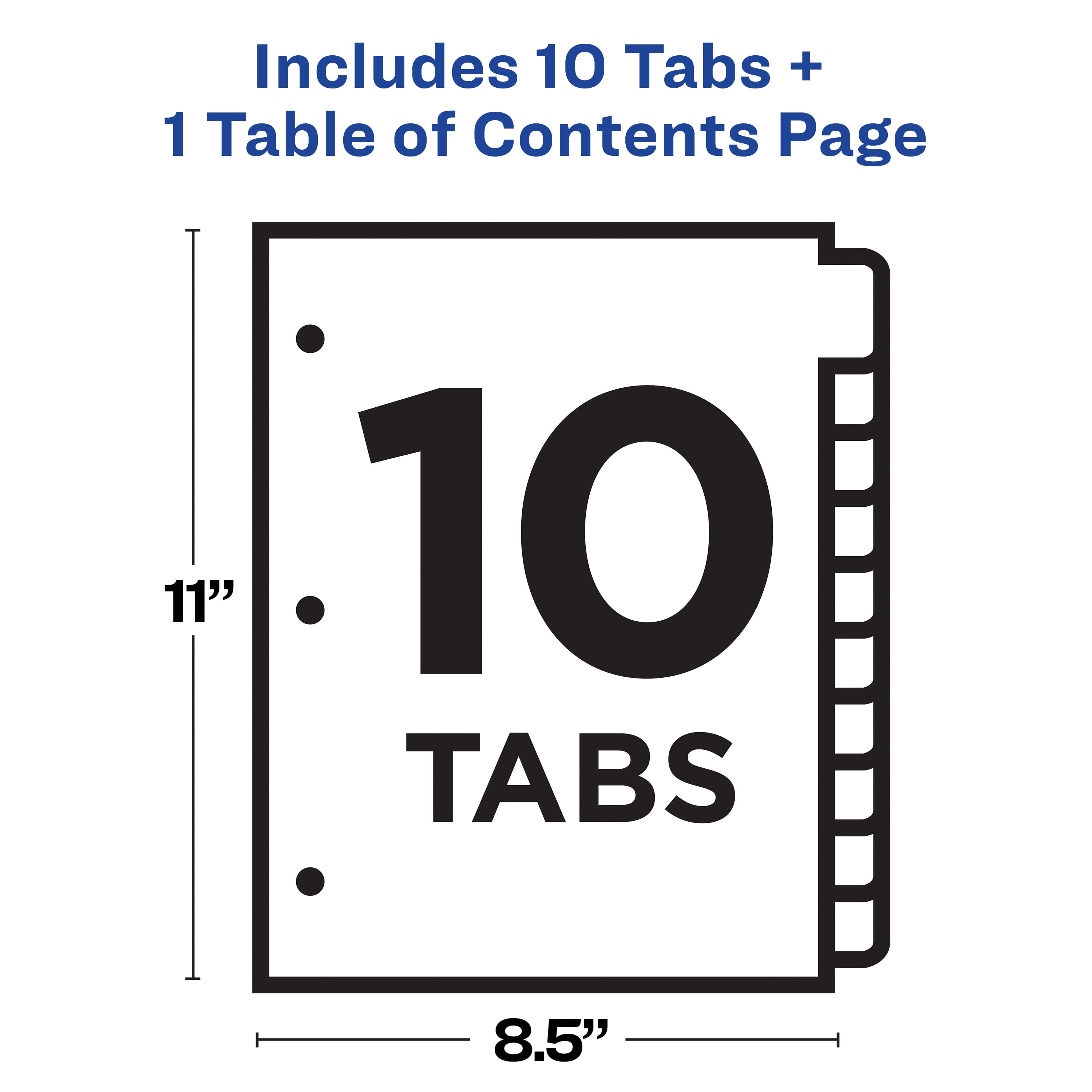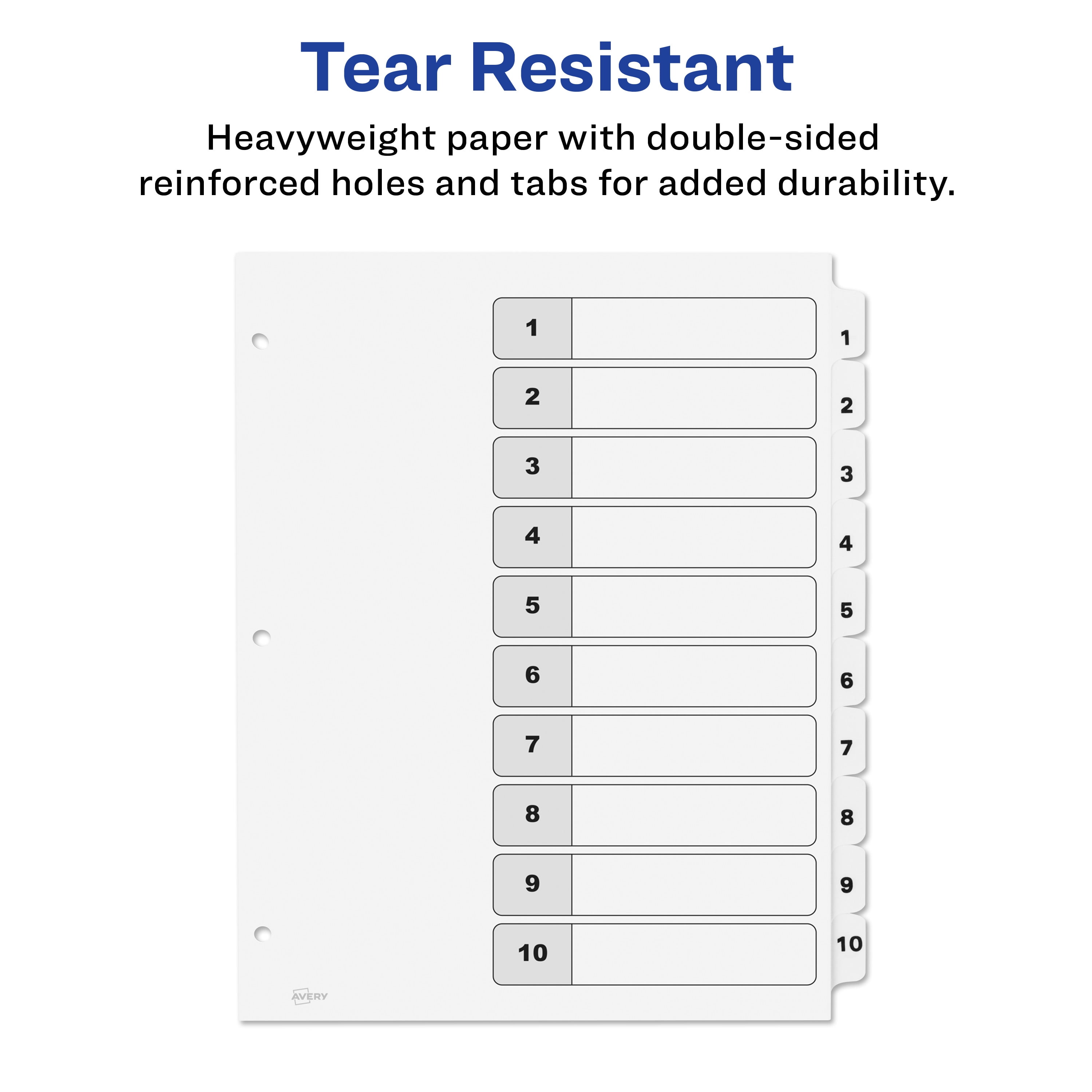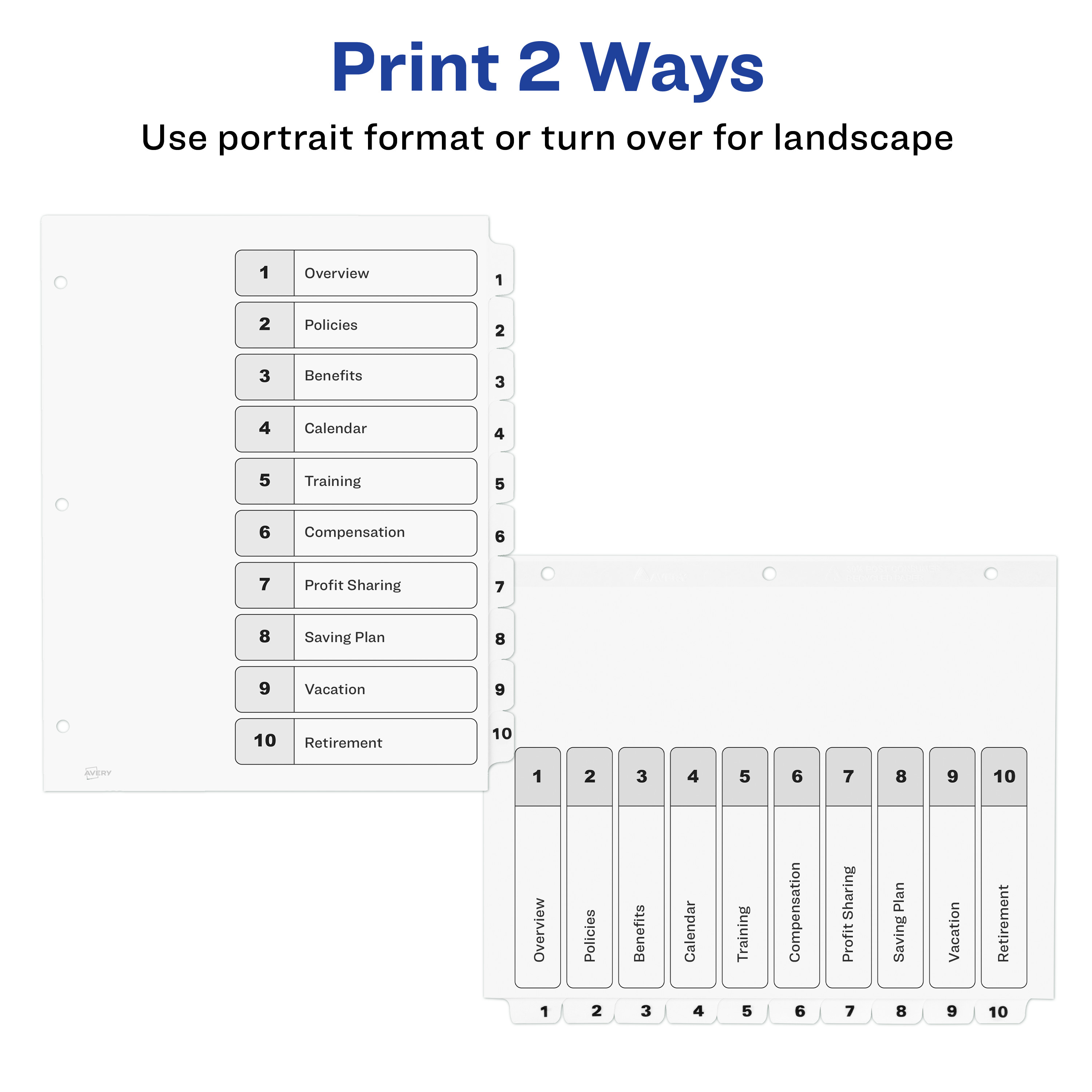 Organize your projects in moments with Avery Ready Index binder dividers. Each white tab is preprinted for a professional appearance. Print your own custom section titles and images onto the table of contents sheet without worrying about labels or inserts. Whether you’re creating planners for classes or hosting a presentation, these dividers are ideal for getting everything sorted. 1 set of 10 dividers are included with each sheet measuring 8-1/2"x11". The 3 binder holes are reinforced on both sides of the heavyweight sheet to prevent creasing and tearing. Each divider tab includes additional reinforcement along the edge of each page to distribute stress and resist folding. The printable table of contents is dual compatible with both laser and inkjet printers. This sheet can also be printed in either portrait or landscape so that your projects can be displayed in any orientation. Just flip the sheet to view the other layout on the opposite side. Try out free templates for these dividers and check out the Avery Design & Print software at avery.com/templates.