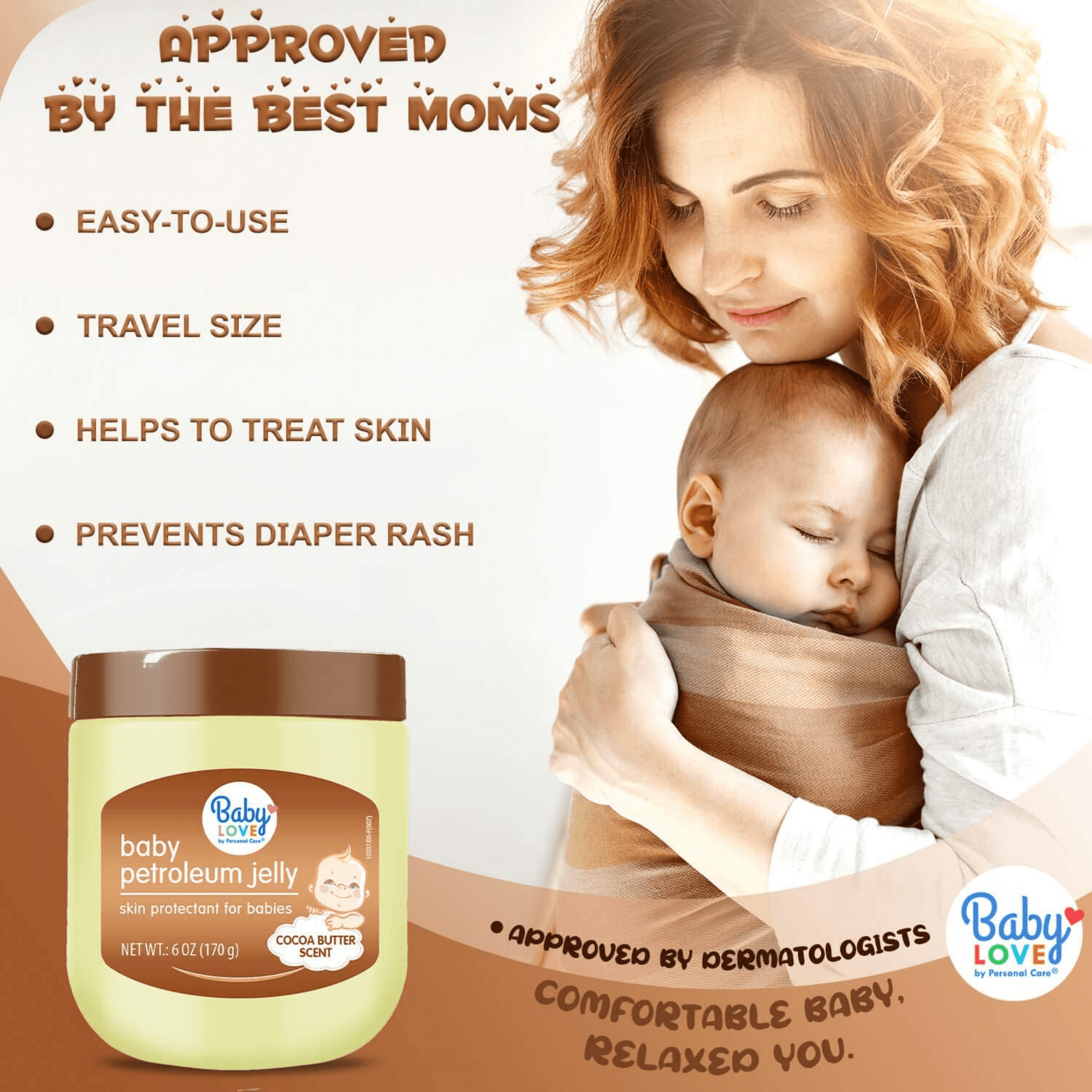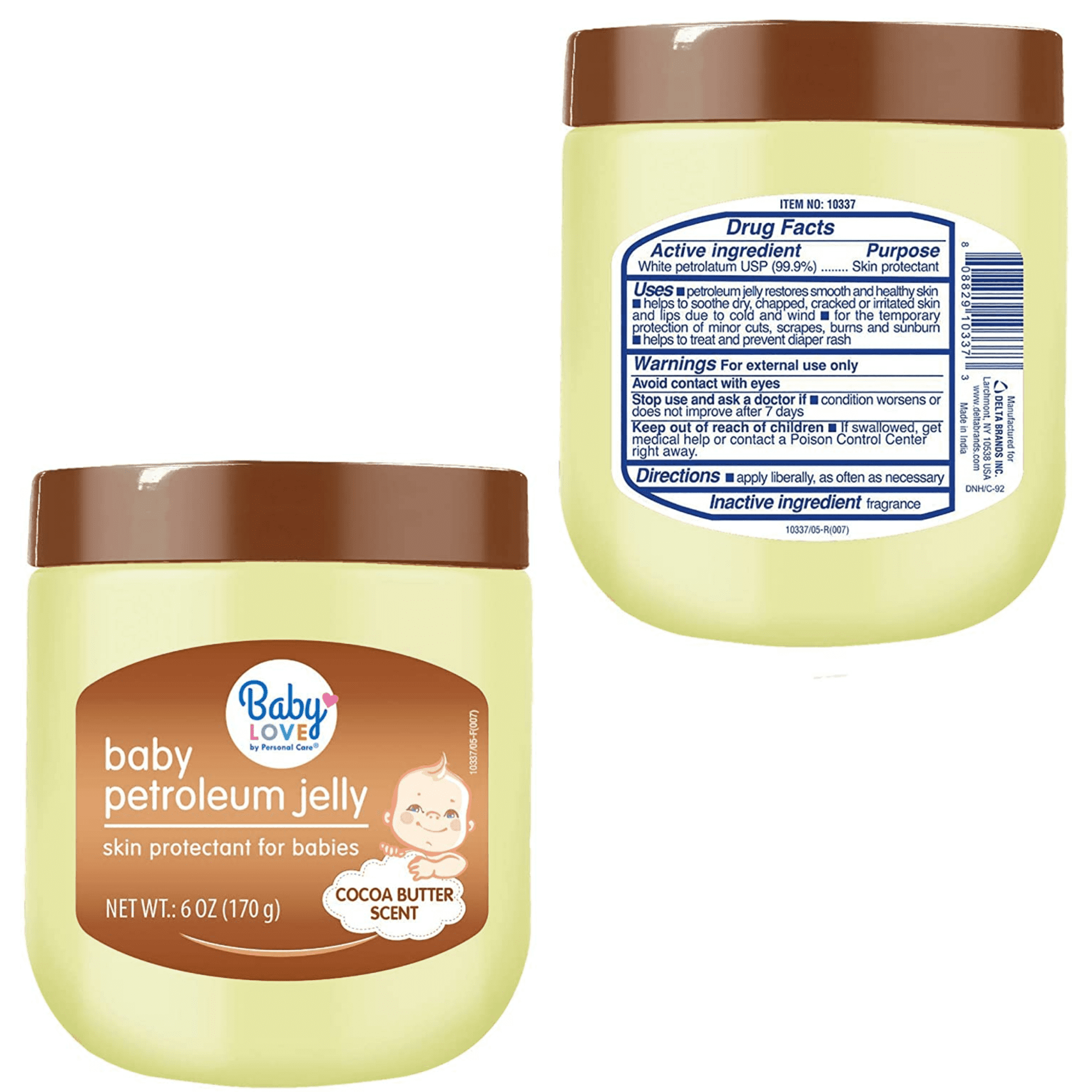 Baby Love by Personal Care Petroleum Baby Jelly for Chafed Skin, Baby Skin Protectant Jelly Forms Protective Barrier Against Moisture and Alleviates Baby Rash, 2 Pack 6 Oz Each Cocoa Butter Scent. Restores smooth and healthy skin. Soothes dry, chapped, cracked or irritated skin and lips due to cold and wind.