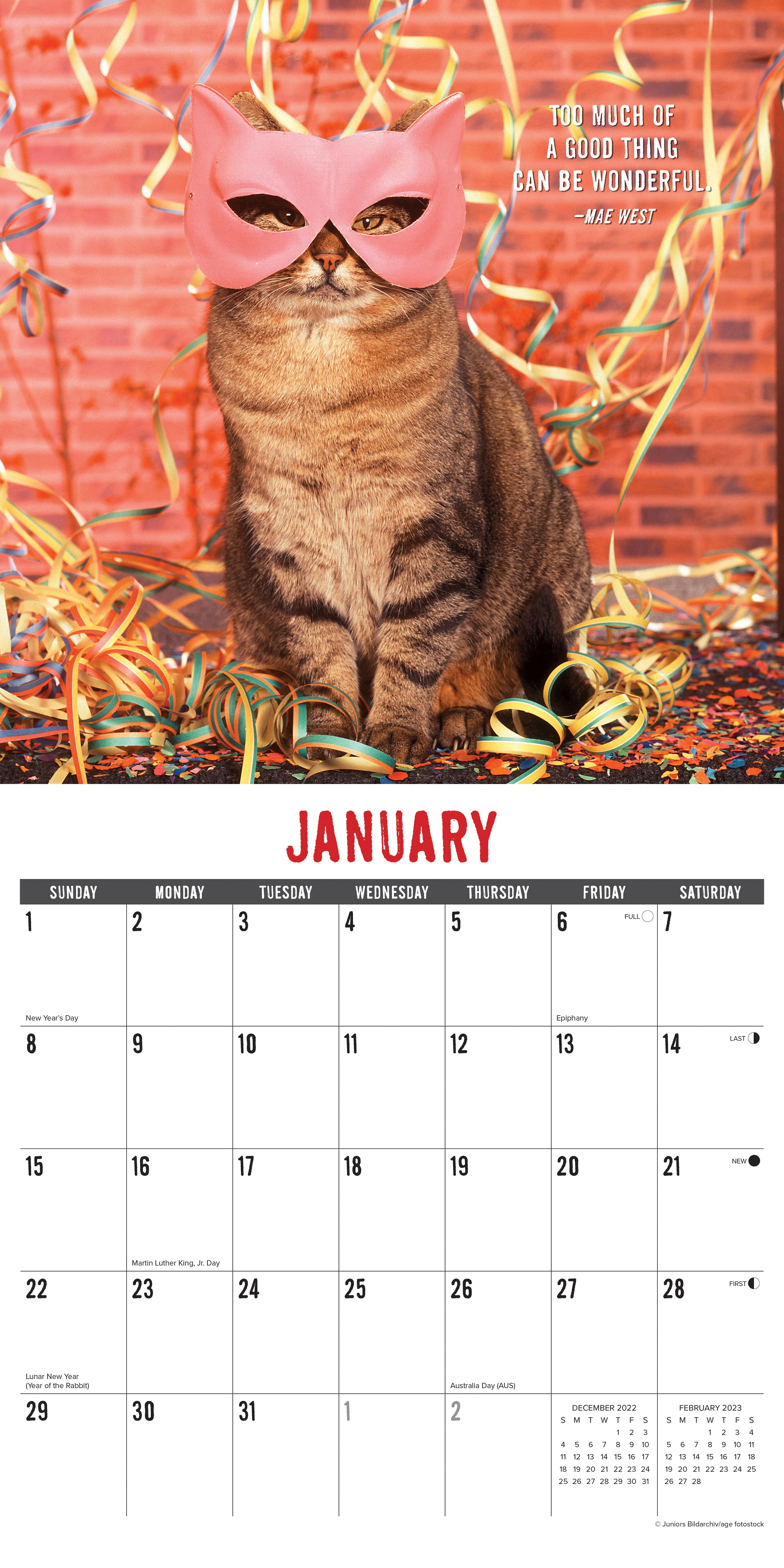 The Seven Deadly Sins have always been wicked, but never have they been more enjoyable! We’ve taken literary samplings of wayward conduct (greed, envy, lust, conceit, temptation, etc.) and matched them with photographs of kittens being terribly naughty. A twelve month celebration of good times and bad behavior that demonstrates it’s only human to be a bad kitty! Printed with soy-based inks on FSC certified paper, this 12" x 12" wall calendar features large monthly grids that offer ample room for jotting notes, along with six bonus months of July through December of 2022. Also includes moon phases (CST), standard U.S. and international holidays.
