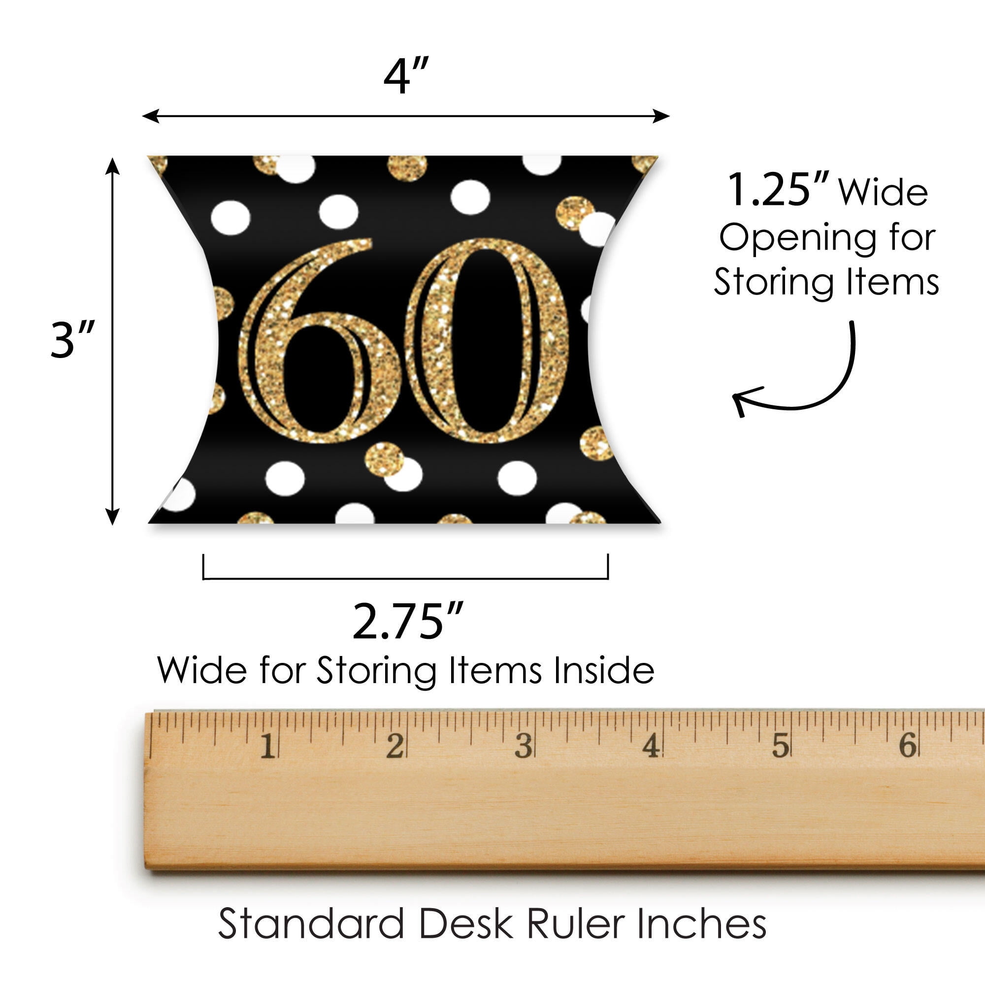 - FUN SIZE: Adult 60th Birthday Petite Pillow Boxes are SIZE 4 inches long x 3 inches wide. When fully assembled, boxes have a 1.25-inch wide opening on each end with a depth of 2.75 inches. Great for all ages, these boxes are ideal for storing bite-sized candy, jewelry, and other miniature gifts.