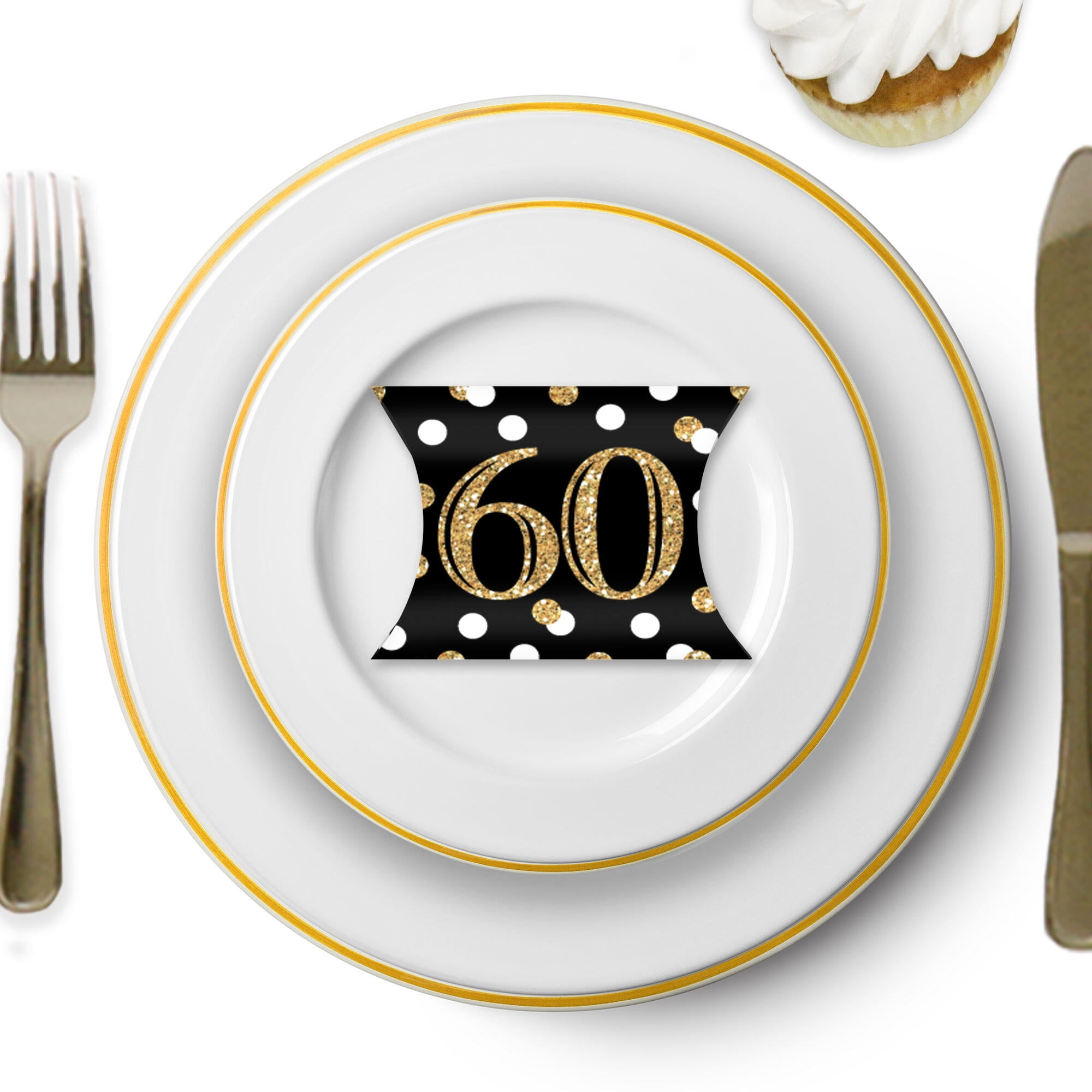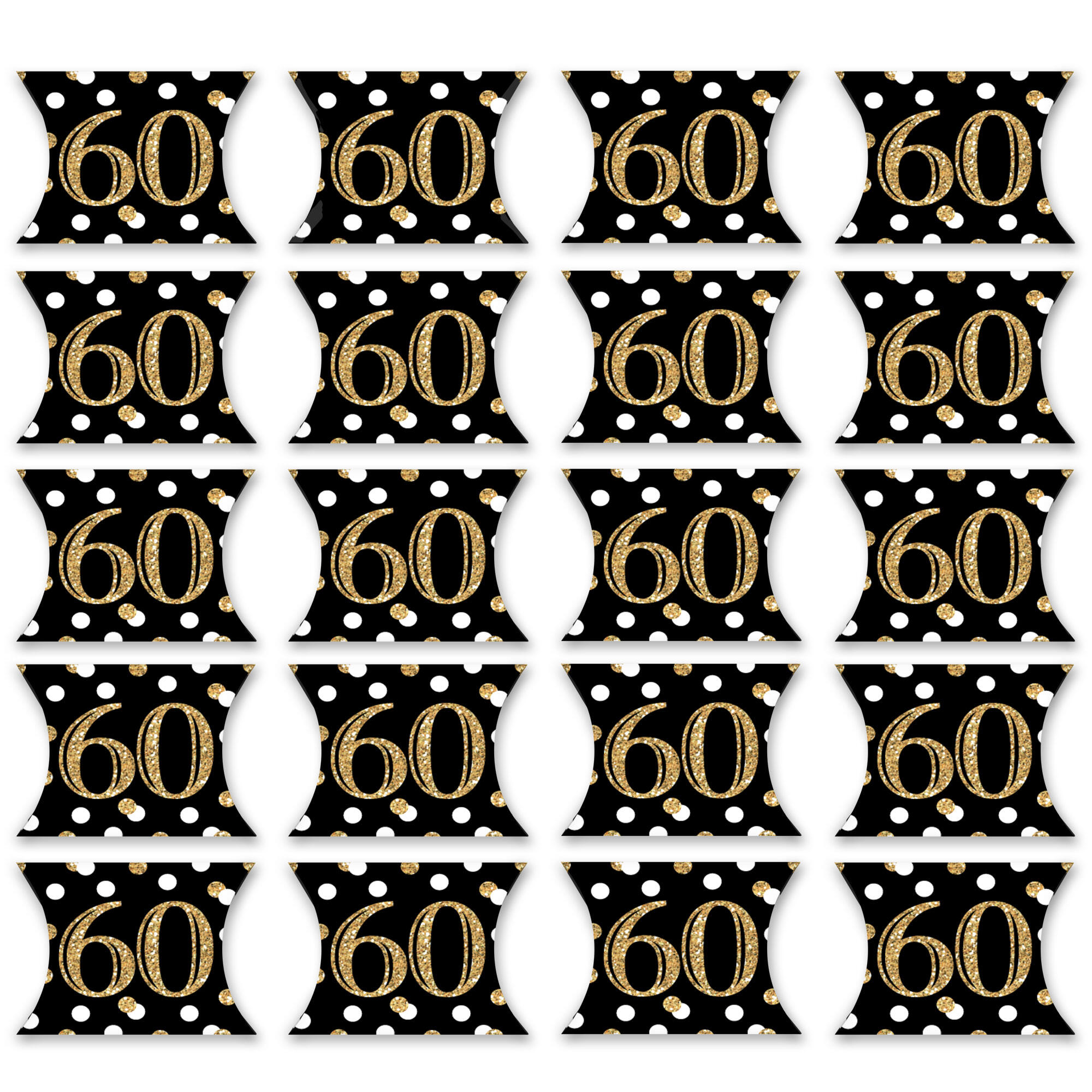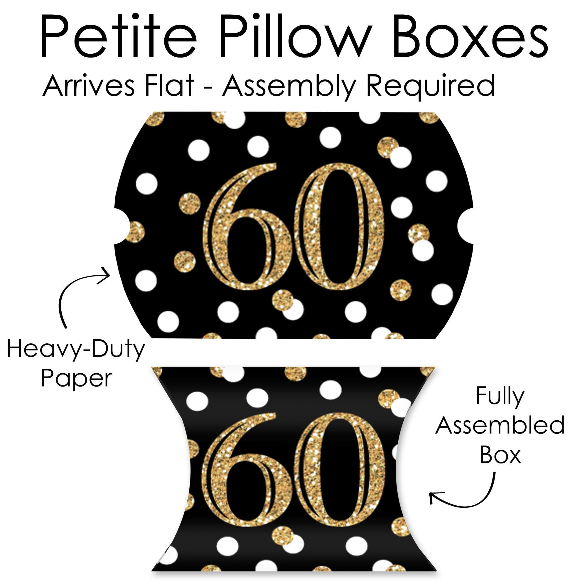 - Adult 60th Birthday Petite Pillow Boxes INCLUDES 20 decorative boxes. Boxes arrive flat and require some easy assembly. Black and Gold petite gift boxes come in a mini size, perfect for a Sixtieth Birthday Party.