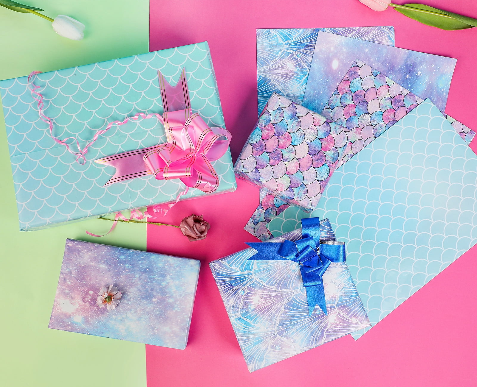 This gift wrapping paper features 4 different patterns: Mermaid Scale Scallop Galaxy, make your gift more vibrant.Perfect for small and medium presents wrap to meet most of your needs, easy to wrap. All occasion wrapping paper used for wedding, bridal showers, women birthday, Thanksgiving Day, Christmas, Easter, Mothers Day, baby showers, valentines, anniversary. Made of high quality paper and pigment material which is friendly to the environment. This wrapping paper sheets will put plentiful creativity to gifts , adding more fun and vitality to the festivals and your special days. Each sheet measures 20" wide x 29"long, a total of 44 square feet in a set. Crafted with 80gsm glossy paper, folded flat and not roll back when wrapping gifts. Sold in a pack of 12 sheets, when not use, easily stack up flat to store
