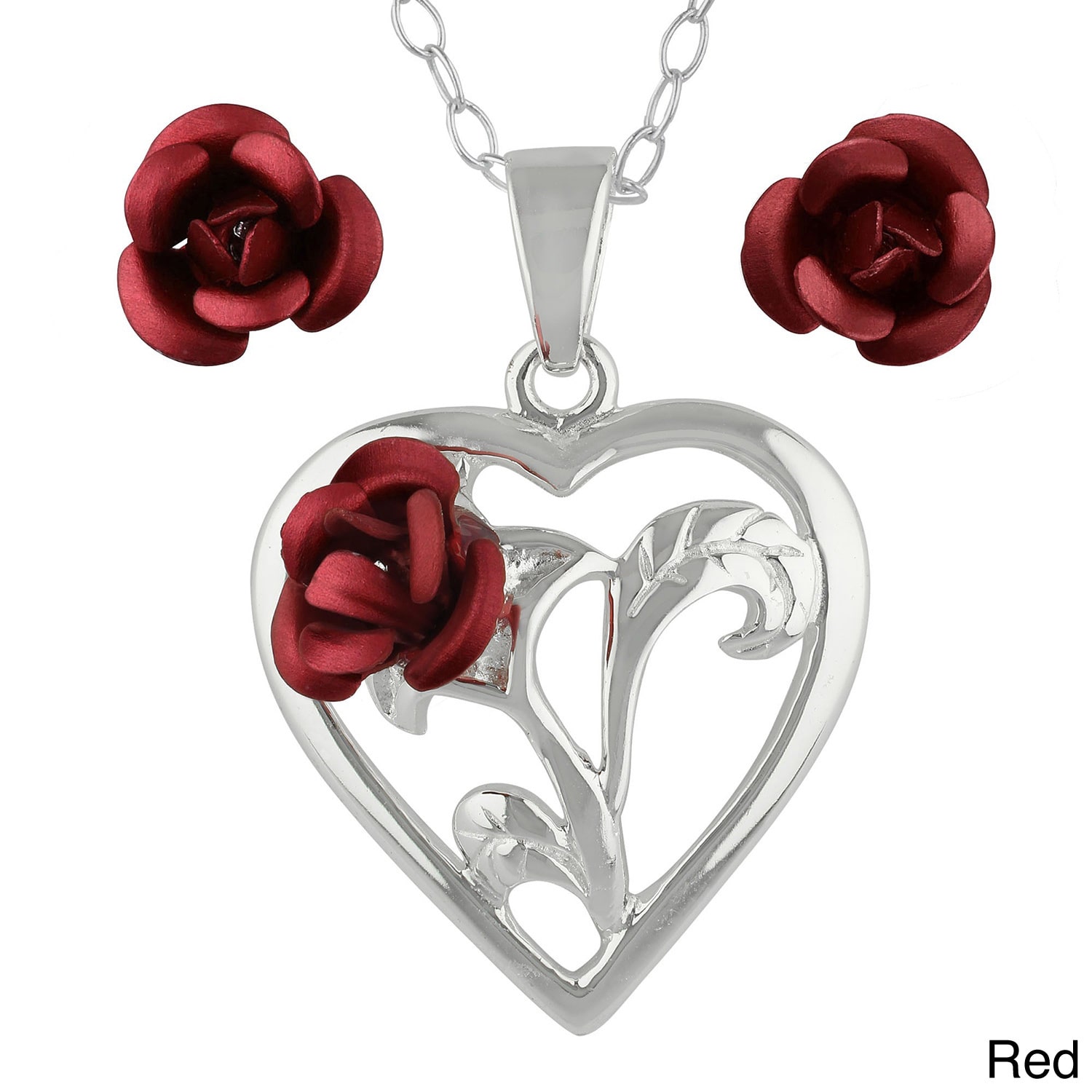 - Sterling Silver Red Rose Heart Pendant and Earrings Set