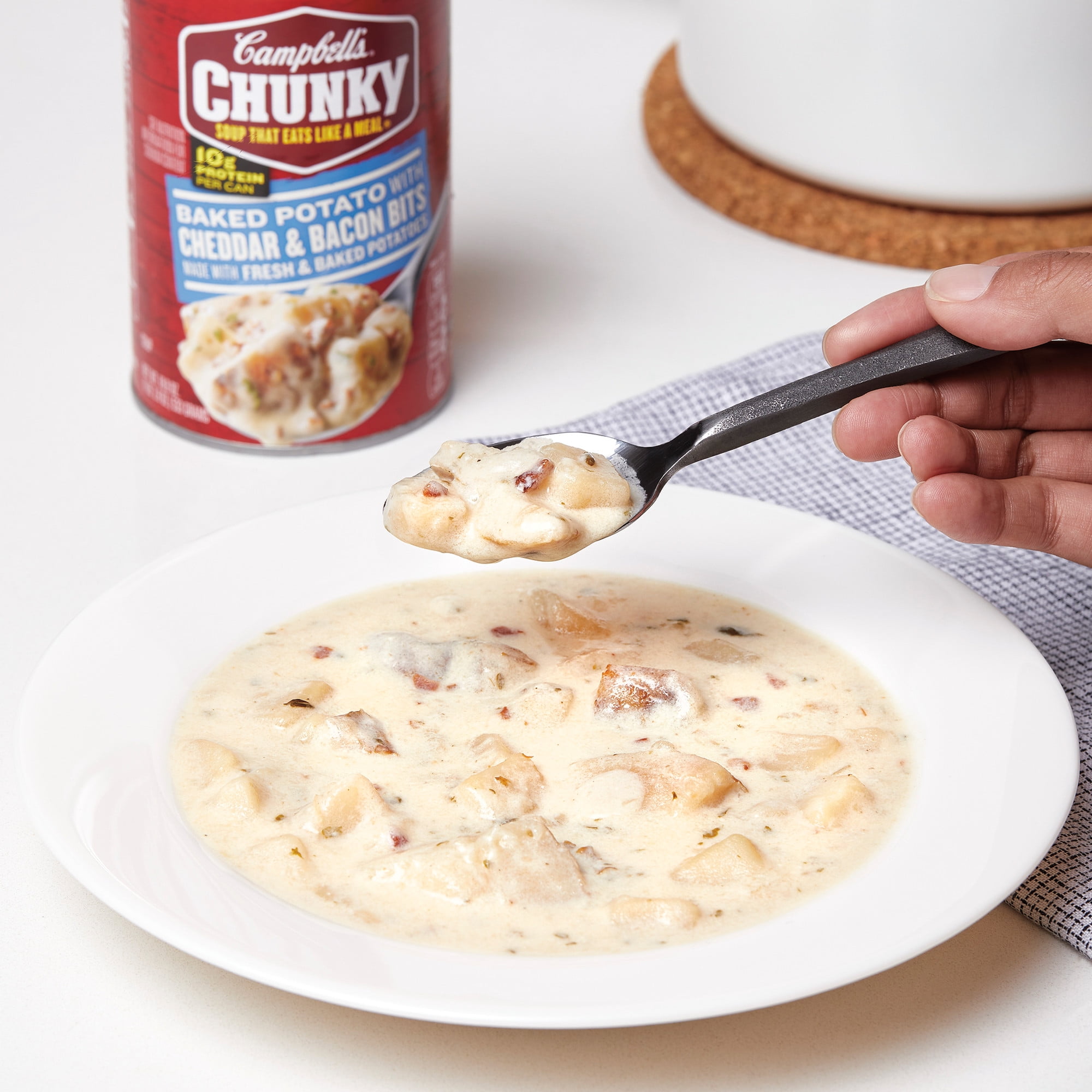 Campbell’s Chunky Baked Potato with Cheddar and Bacon Bits Soup isn’t just tasty-it’s made to work as hard as you do. With never-ending big flavors and bold ingredients, this comfort food classic is capable of fueling even the heartiest appetite. This ready-to-eat soup is crafted with chunks of potatoes, savory bacon and cheddar cheese. Each can has 10 grams of protein (1). It Fills You Up Right. Just pop this potato soup in a microwave-safe bowl, heat and enjoy. Or, warm it over the campfire on your outdoor adventures. Whether you’re looking for quick and easy to microwave soups for home or something to take on the go, Campbell’s has you covered. Take on the great outdoors with Campbell’s Chunky Baked Potato with Cheddar and Bacon Bits Soup-Soup That Eats Like a Meal.In addition to Baked Potato with Cheddar and Bacon Bits Soup, Campbell’s Chunky Soup is also available in other hearty varieties, like Classic Chicken Noodle, New England Clam Chowder and more.(1) See nutrition information for sodium content.