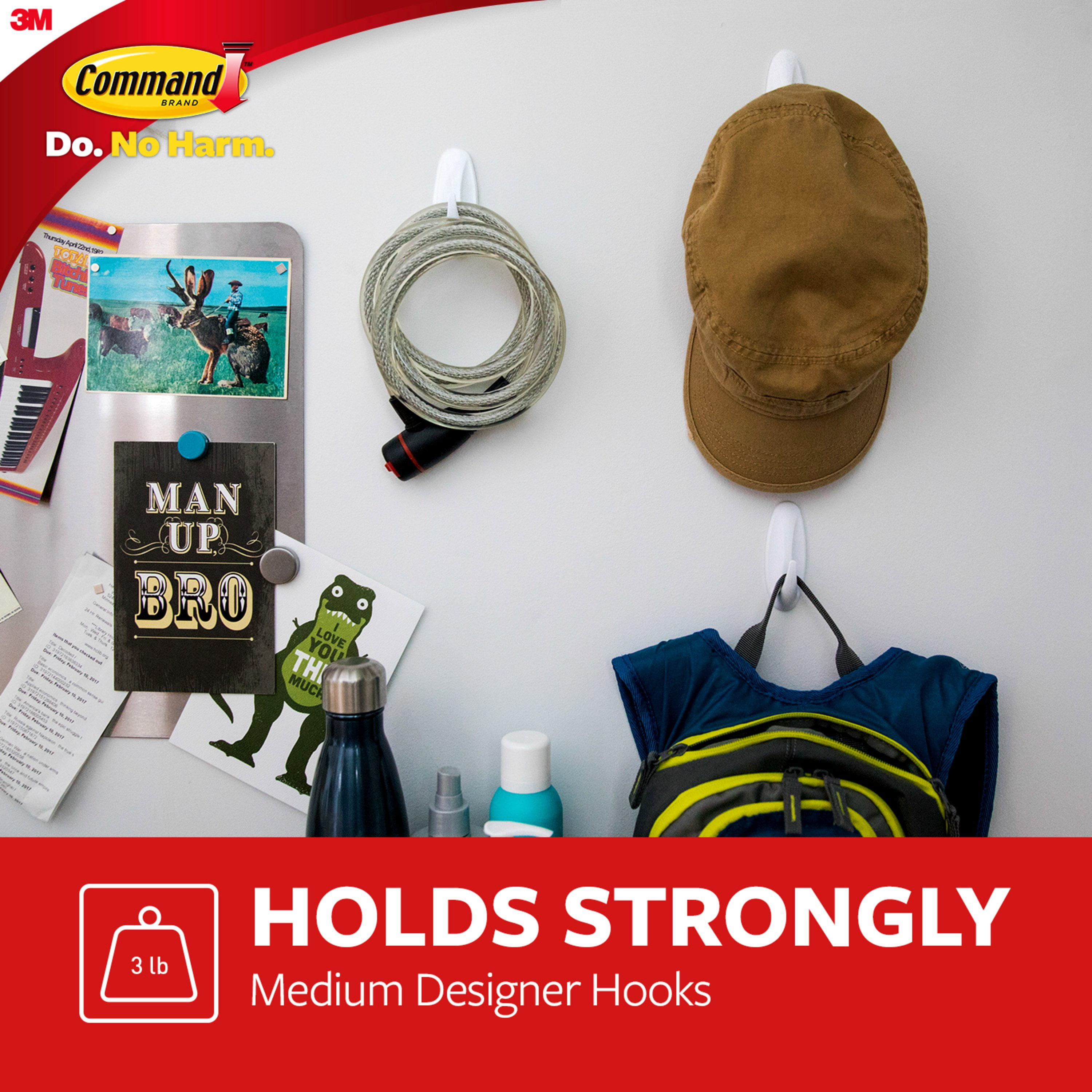 Command Damage-Free Hanging, Holds Strongly, Removes Cleanly.Command Hooks are available in a wide range of designs to match your individual style and decor. They also come in a variety of sizes and hold a surprising amount of weight – up to seven and a half pounds! Forget about nails, screws and tacks, Command Hooks are fast and easy to hang! Using the revolutionary Command Adhesive, stick to many surfaces, including paint, wood, tile and more. Yet, they also come off leaving no holes, marks, sticky residue or stains. Rehanging them is as easy as applying a Command Refill Strip, so you can take down, move and reuse them again and again!