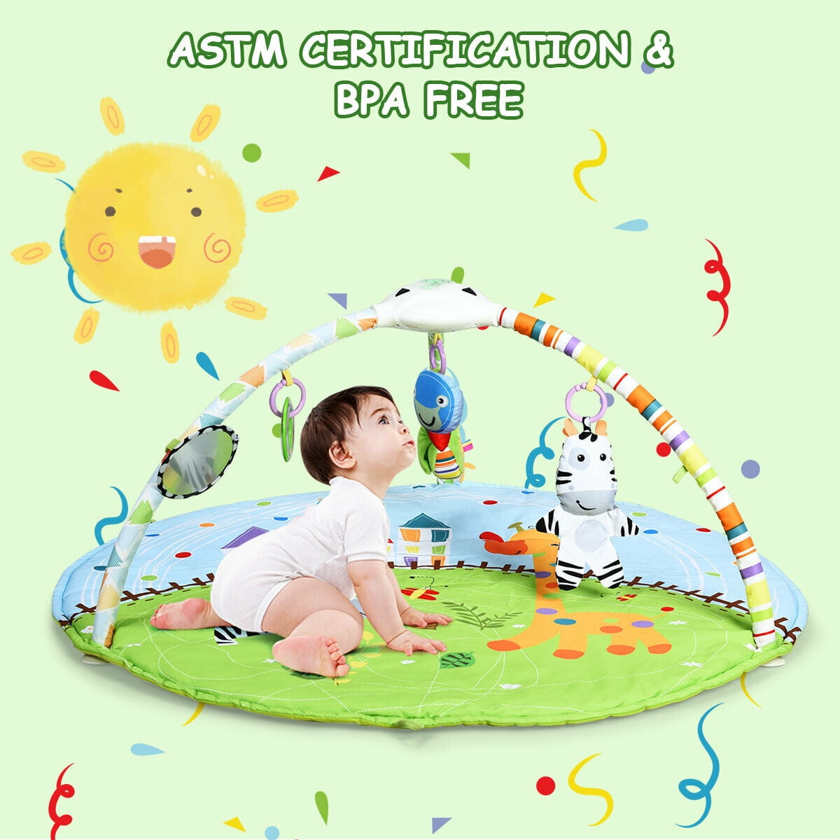 The attractive appearance and lovely hanging pendants with lights and music will catch the baby’s attention at first sight. The light will display the star and moon on the wall will inspire baby’s curiosity about the universe and the soft music will calm the baby’s emotions, which can let them forget to cry. The thicken mat, which is filled with soft materials is comfortable for baby using and easy for mom to clean. Besides, the all raw materials we use are safe and non-toxic and passed the ASTM certification. So why not place the order and buy now!