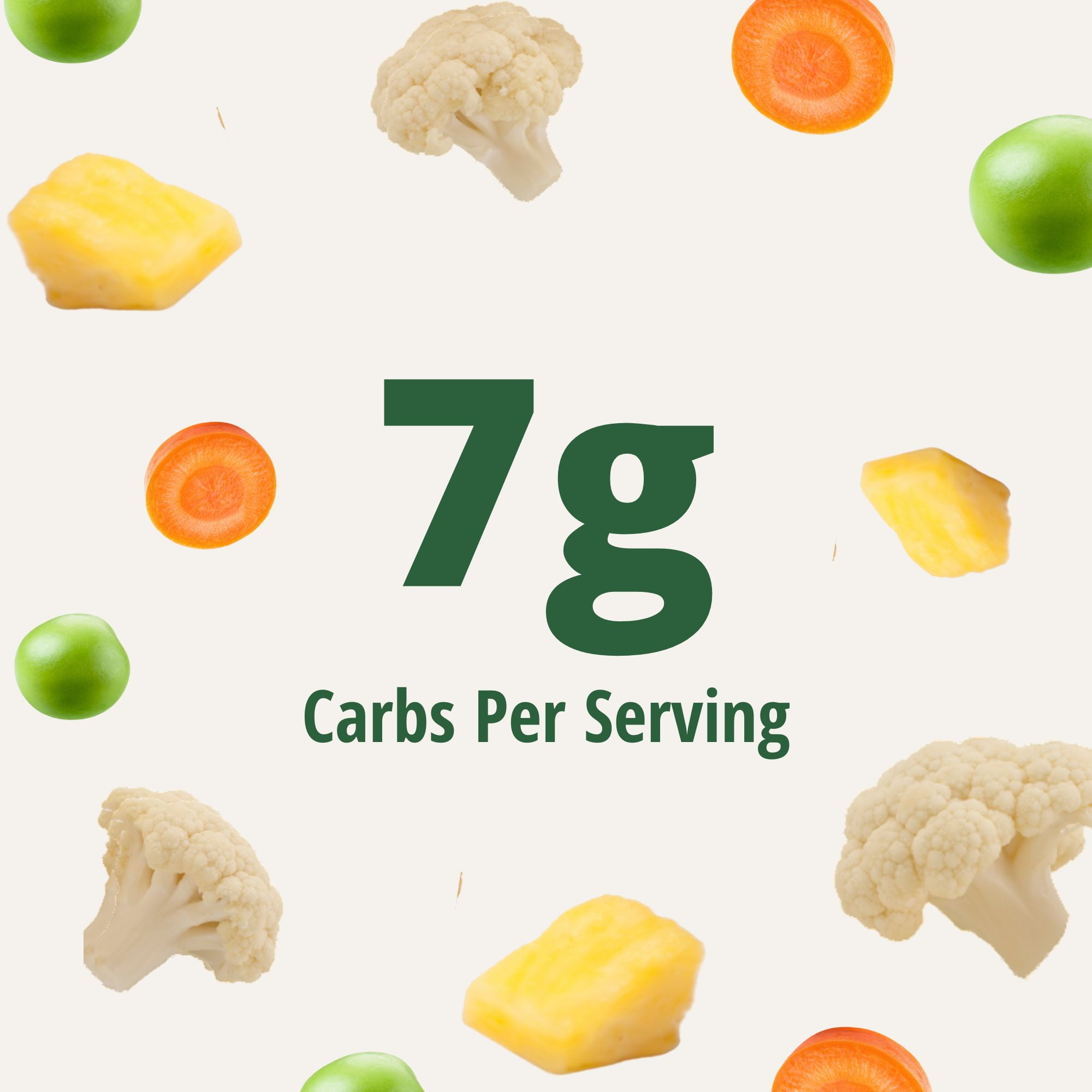 Del Monte Veggieful Riced Cauliflower frozen dishes feature cauliflower rice, pineapple, peas, carrots, and Terriyaki garlic soy sauce seasonings for a flavorful frozen side dish. Del Monte Teriyaki Riced Cauliflower contains 7 grams of carbs per serving, 1 full serving of veggies* per serving and has 70% fewer calories than prepared white rice** for an amazing fresh vegetable taste. Bring the wholesome goodness of the earth to your dinner table with Del Monte Veggieful Teriyaki Riced Cauliflower. ±Ingredients of the types used in this product are not genetically modified or bioengineered