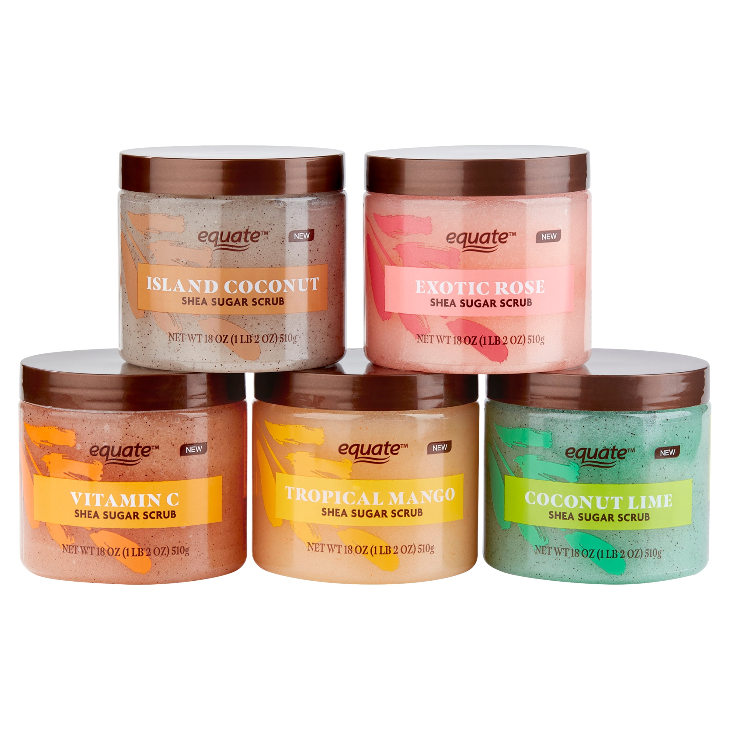 Equate Exotic Rose Shea Sugar Scrub is an exfoliating body scrub that removes dull, dry skin to reveal glowing, soft, smooth skin. Made with pure shea butter and sugar to soften and moisturize skin. Use regularly to polish away dead skin cells or to prep skin as a pre-shave treatment.