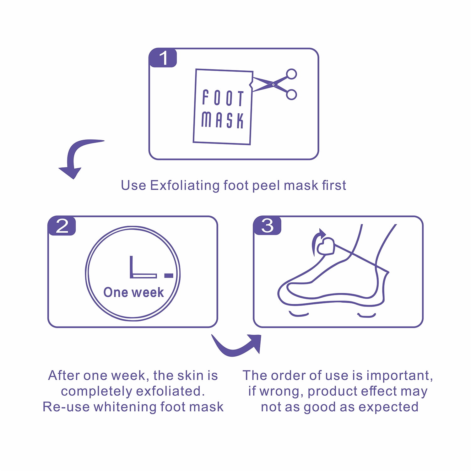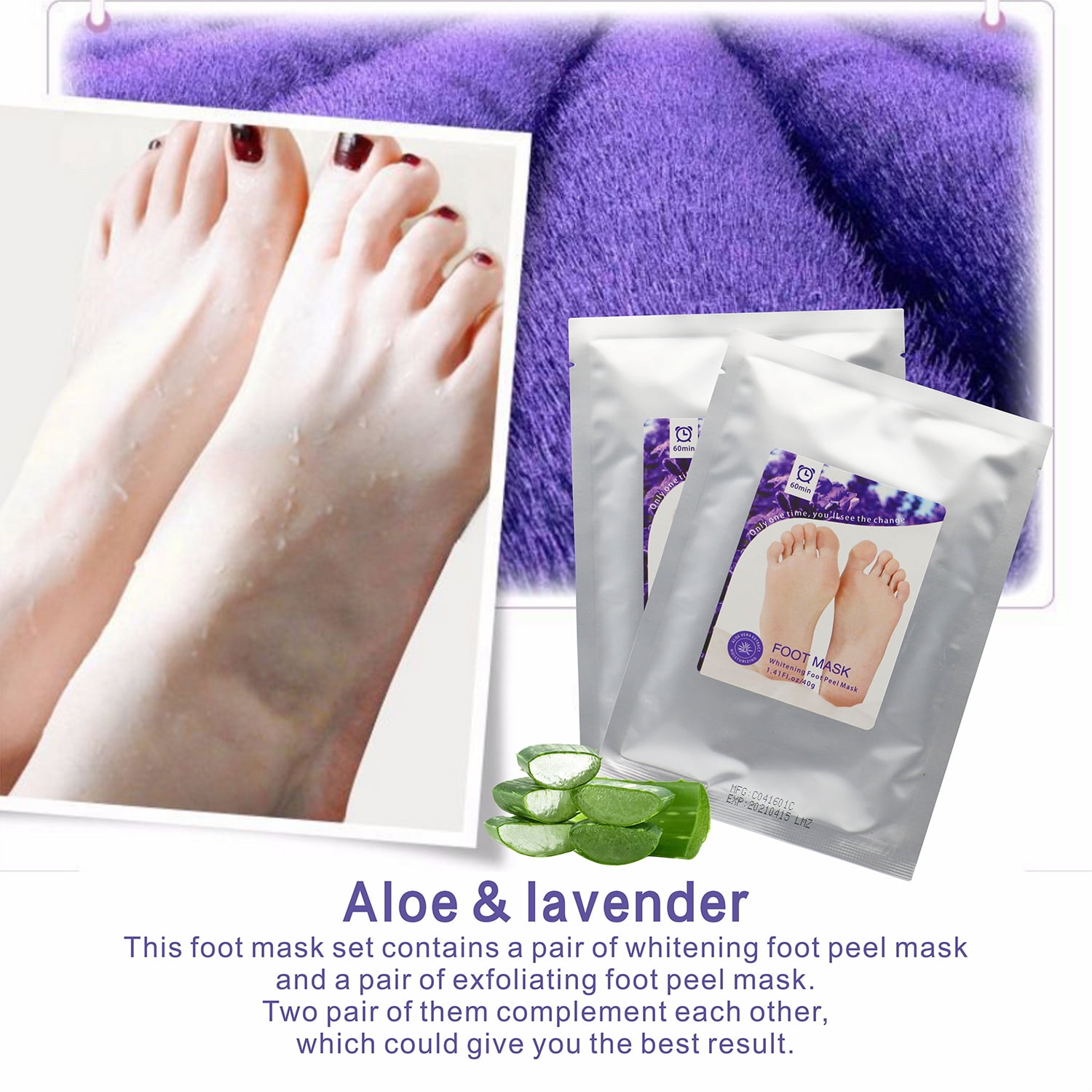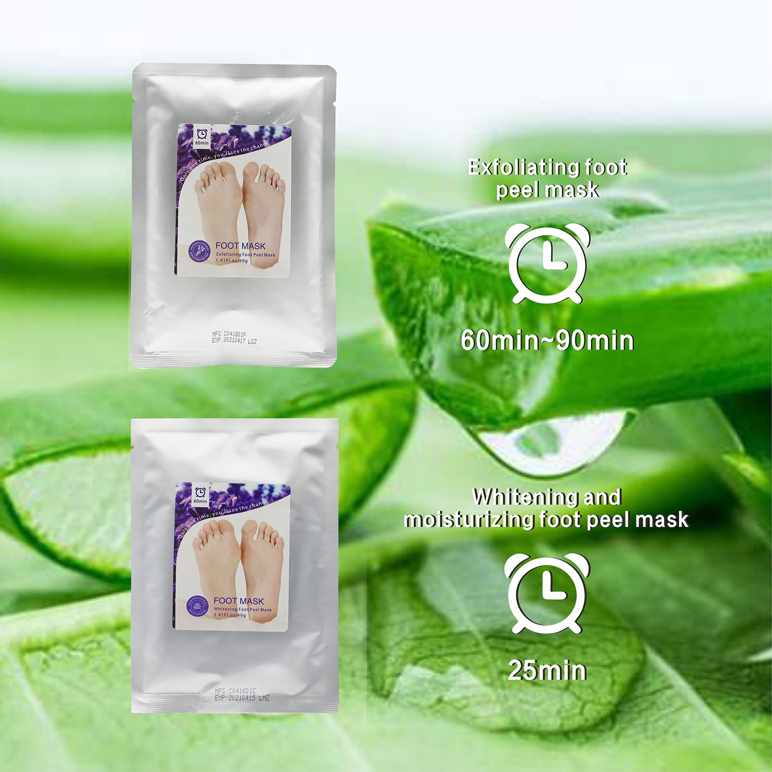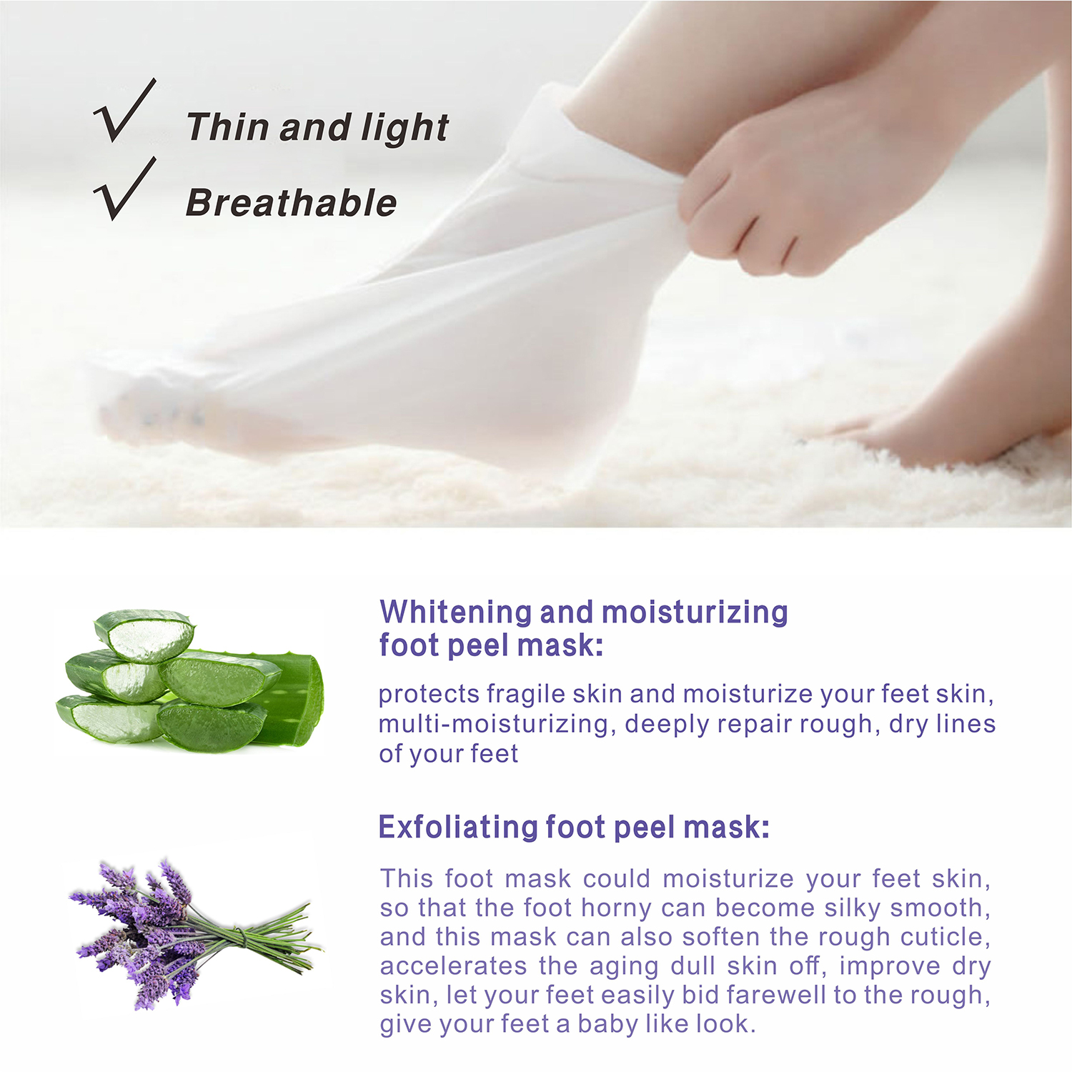 Name: foot maskColor: transparentScent: lavender, aloe veraShelf life: 3 yearsProduct certificate: FDA/MSDSProduct weight: 140gProduct specification: 80gProduct size: 13.5cm*20cm*1.9cmProduct features:Whitening and moisturizing foot mask: take care of fragile skin, nourish foot skin, moisturize many times, tender and clean, deeply repair rough and dry feet.Powerful peeling foot film: moisturize the foot skin, restore the soft and silky cutin on the foot, soften the rough cuticle, accelerate the aging, dull and dead skin peeling, improve the dry skin, and let the feet say goodbye to the rough easily.Restore baby like jade delicate feet.Product ingredients:A box of foot film contains two pairs, divided into two flavors, the ingredients and efficacy are different (better with use) details are as follows:Whitening and moisturizing foot mask *1 pair (aloe vera flavour)Ingredients: water, glycerin, glycerin stearate, hydrogenated jojoba oil, aloe extract, sodium hyaluronate, polyglutamic acid, glycyrrhizic acid, tocopherol (vitamin E), xanthan gum, dodecyl benzeneSodium sulfonate, phenoxyethanolStrong exfoliating foot mask *1 pair (lavender)Ingredients: water, glycerin, ethanol, almond acid, sodium dodecyl benzene sulfonate, lactic acid, milk extract, MELALEUCA ALTERNIFOLIA extract, aloe extract, waterSolution collagen zinc, hydrogenated castor oil, triethanolamine, lavender (LAVANDULA ANGUSTIFOLIA) extract, essenceApplicable symptoms: dry, rough, cracked foot skin, calluses, cuticle hardeningFoot Mask 2 Pairs,Exfoliating Foot Peel Mask,Peel Away Calluses & Dead Skin, Repair Rough Heels in 1-2 Weeks