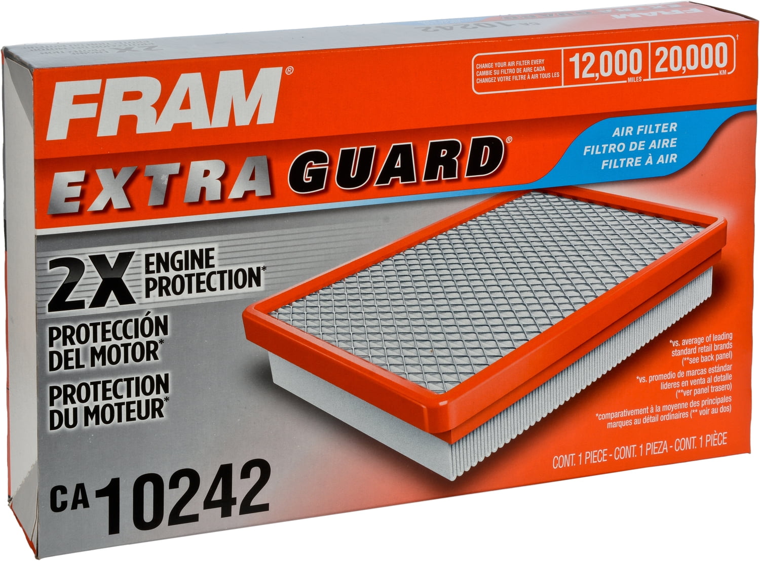 FRAM Extra Guard Air Filters are your first line of defense preventing damaging road dust and dirt particles from entering your engine. Extra Guard Air Filters are engineered with an advanced filter media that lets through 2X less dirt than average leading standard retail brands AND protects your vehicle’s engine up to 12,000 miles. Replacing a dirty air filter with a new FRAM Extra Guard Air Filter can help increase horsepower, acceleration and overall engine performance. Get better protection with ease and install a new FRAM Extra Guard Air Filter today!