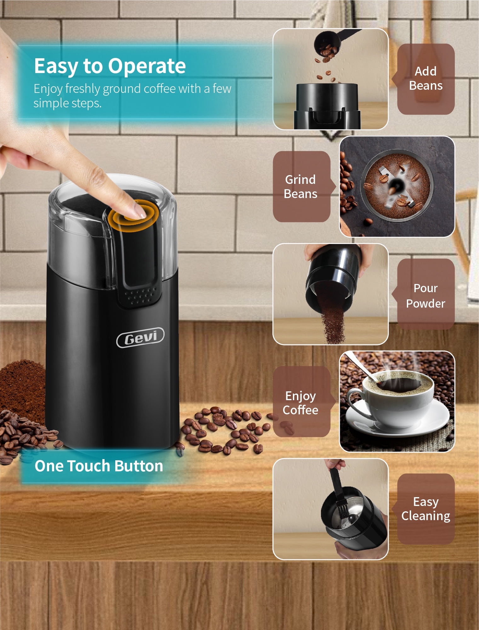 Gevi Black 2.08 Ounces Electric Coffee Grinder Stainless Steel Blade Grinder allows you to enjoy delicious coffee at home.