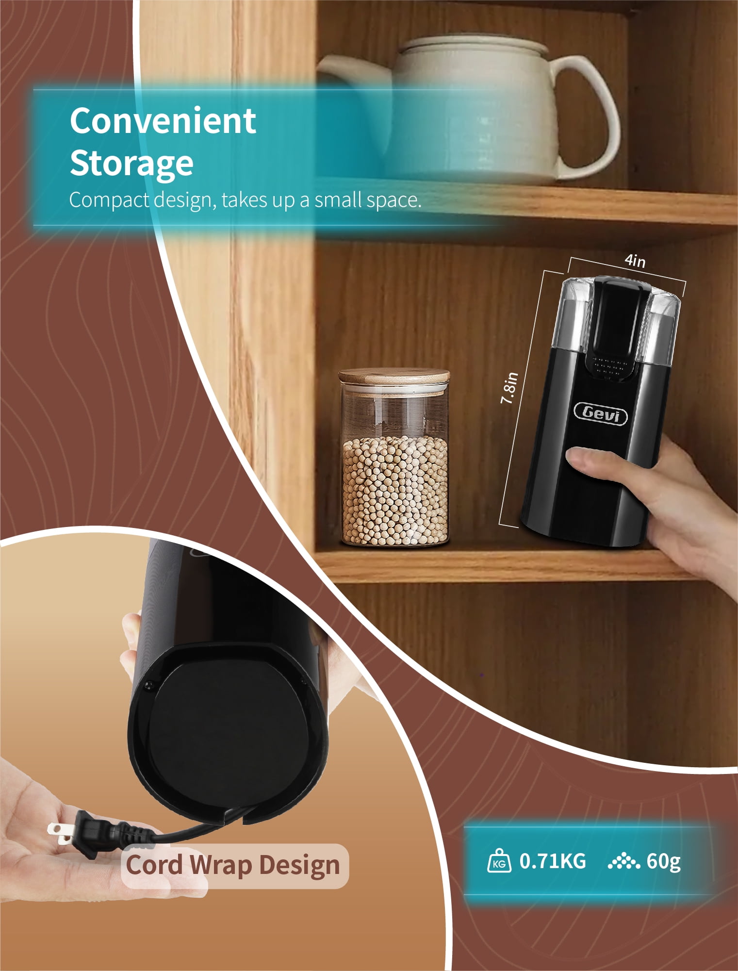 - Compact & Stylish: With smart design, This coffee grinder takes up minimum counter space and can be easily stored in cupboards and drawers. Smaller and more portable than hand coffee grinder. Especially, a hide-away cord storage design at the bottom of the grinder stores. The cord is neat and out of sight when it is not in use.