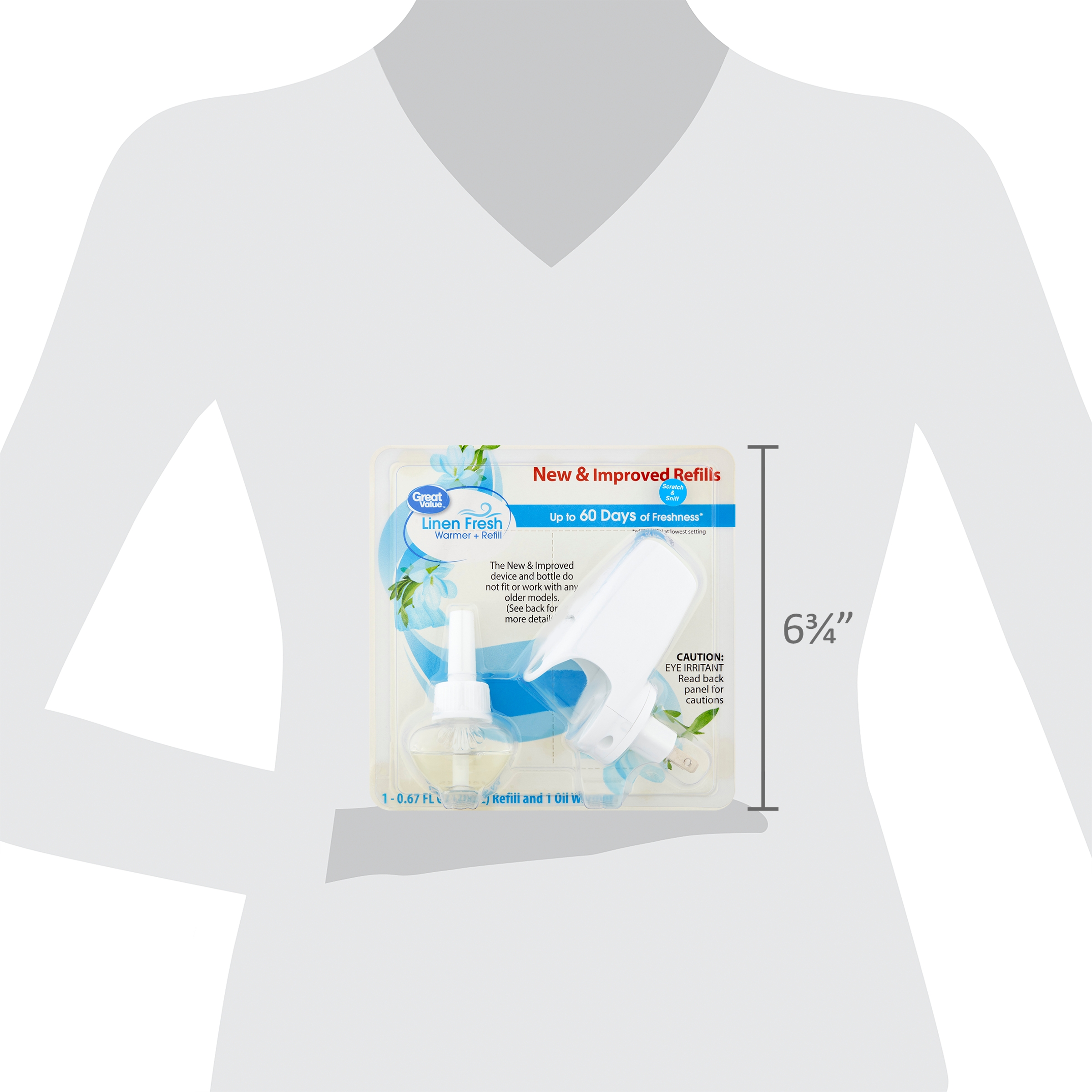 Create a warm and welcoming environment in your home with a little help from the fresh scent of our new and improved Great Value Linen Fresh Warmer + Refill Set. Our plug-in scented oil warmers and oils work together to disperse your favorite scents throughout your home. The Linen Fresh scent intertwines gentle freesia and lily blossoms with refreshing notes of apple and melon. Accents of blonde woods and amber complete this clean fragrance. Simply remove the cap from your Great Value Scented Oil Refill, insert it into your Great Value Scented Oil Warmer until the bottle "clicks," plug your warmer with your selected Great Value Scented Oil Refill into an outlet, and it will instantly start releasing a soothing aroma into the air. Enjoy weeks and weeks of long-lasting fragrance with our Great Value Linen Fresh Warmer + Refill Set.