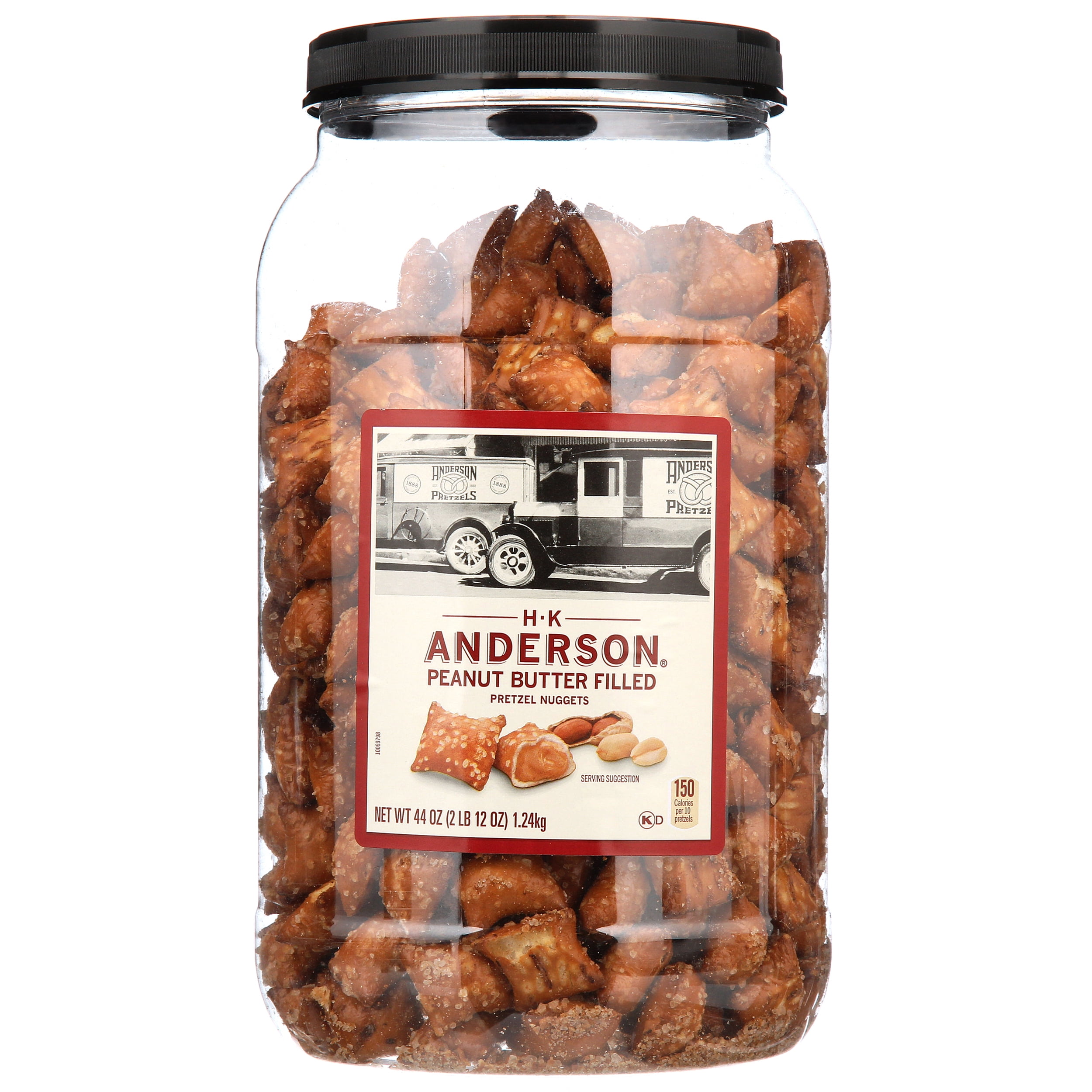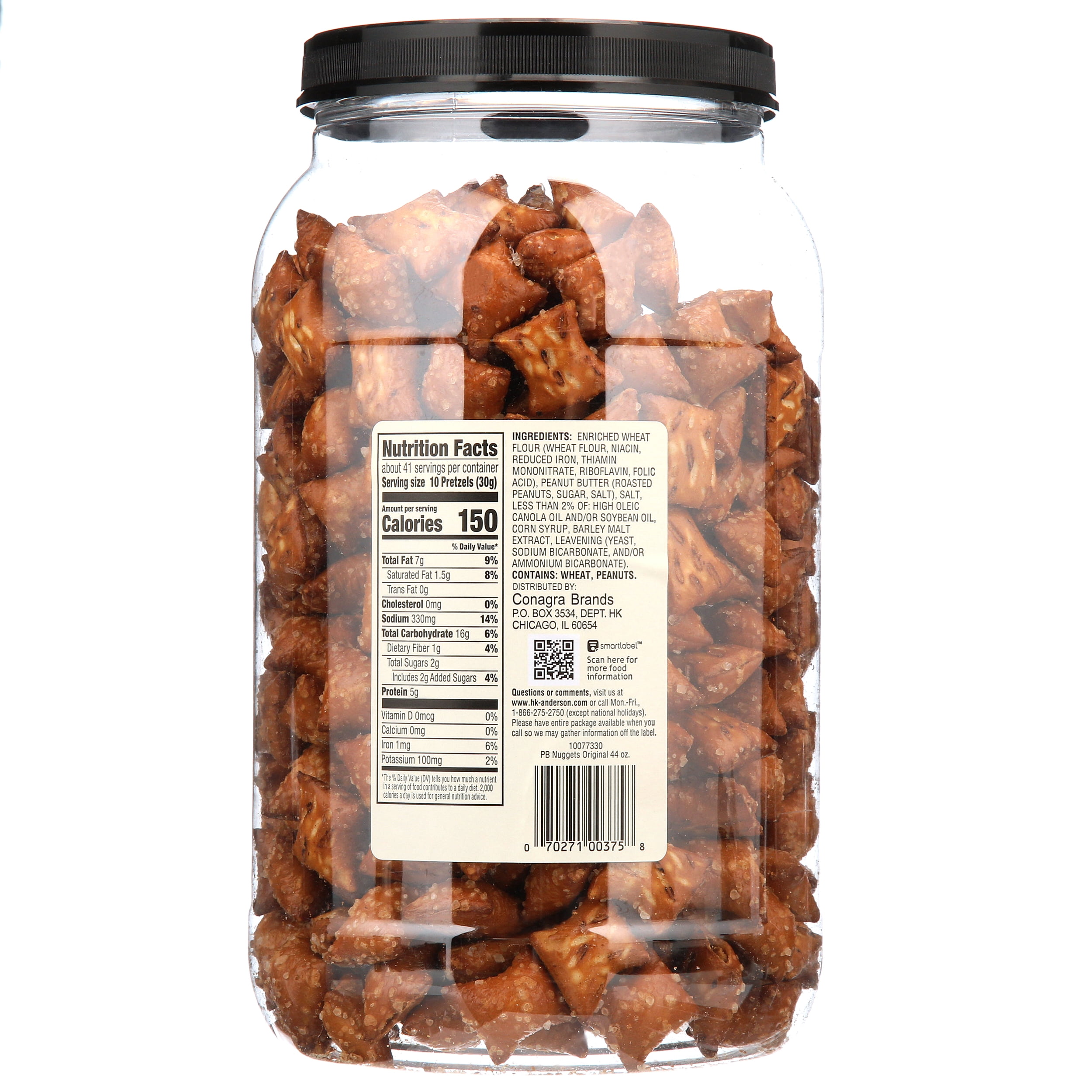 Fuel your sweet and salty snack craving with these HK Anderson Peanut Butter-Filled Pretzel Nuggets. Combining the salty flavor and crunchy texture of pretzels with the smooth, creamy texture and sweet taste of peanut butter, these pretzel nuggets work to satisfy just about any kind of snack craving. These peanut butter-pretzel snacks are an excellent any-time treat as each piece is perfectly bite-sized for enjoying as much or as little as you’d like at a time and are also travel-sized for your enjoyment of having a delicious snack on the go. Satisfy your snack cravings with HK Anderson Peanut Butter-Filled Pretzel Nuggets.