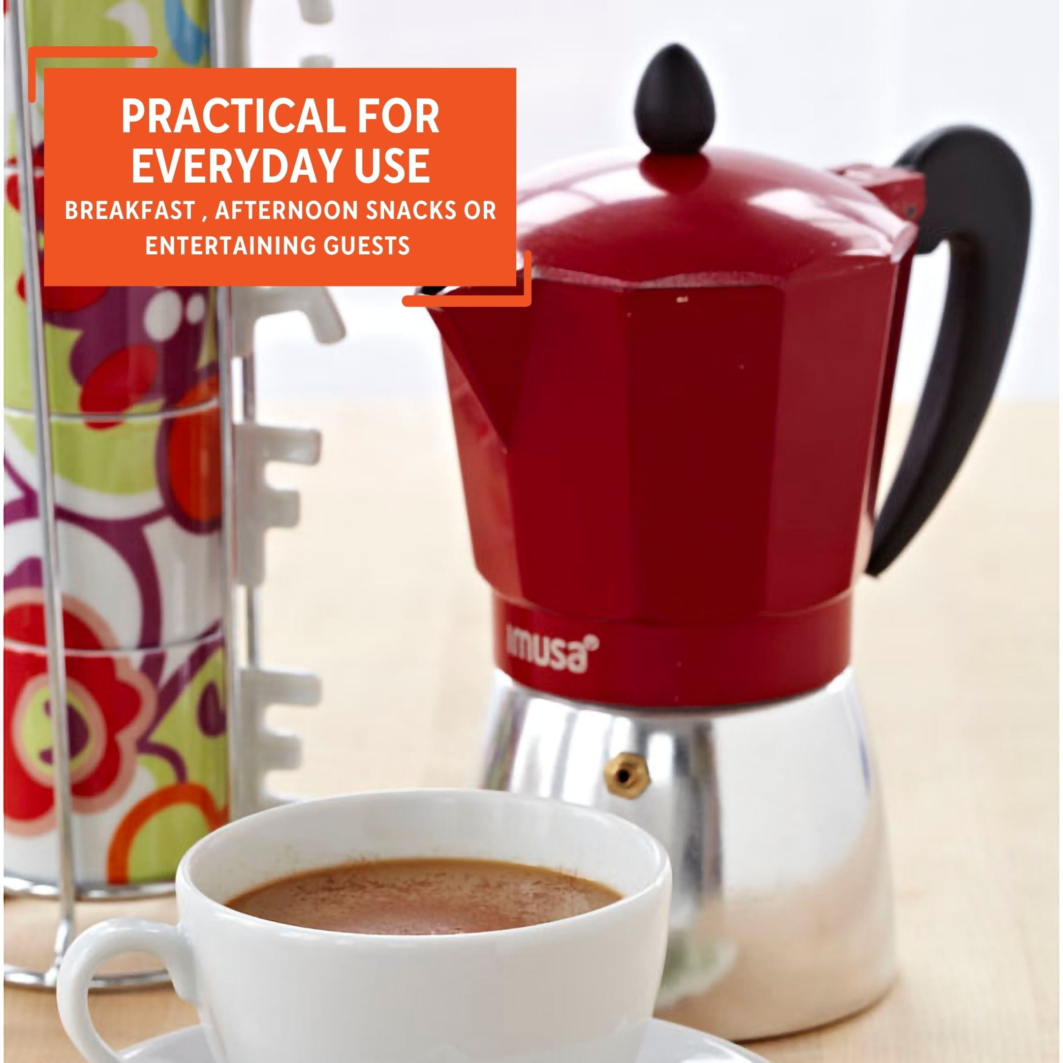 IMUSA stovetop espresso makers allow you to be a barista at home! This 6 cup espresso maker in red makes fresh espresso in just minutes. This stovetop espresso maker brews under mild pressure, forcing hot water up from the base through the ground coffee and then into the top carafe in just minutes! The aluminum exterior will match perfectly with your kitchen decor and will satisfy the need of just about any coffee lover. You will love the rich, full-bodied flavor produced by this stove-top method, made popular in Europe and Latin America. Experience the taste of fresh espresso made right at home. The bakelite handle makes it easy to serve with and the lid with knob allows you easy access to brewing. Explore with the IMUSA coffee maker by making espresso with your favorite brand of coffee. The options are endless. To create your espresso simply Add water to the bottom half (do not Exceed Safety Value), Lay the coffee into Funnel, Assemble it together, and place it on the stove until the brewing process is complete lastly, ENJOY!