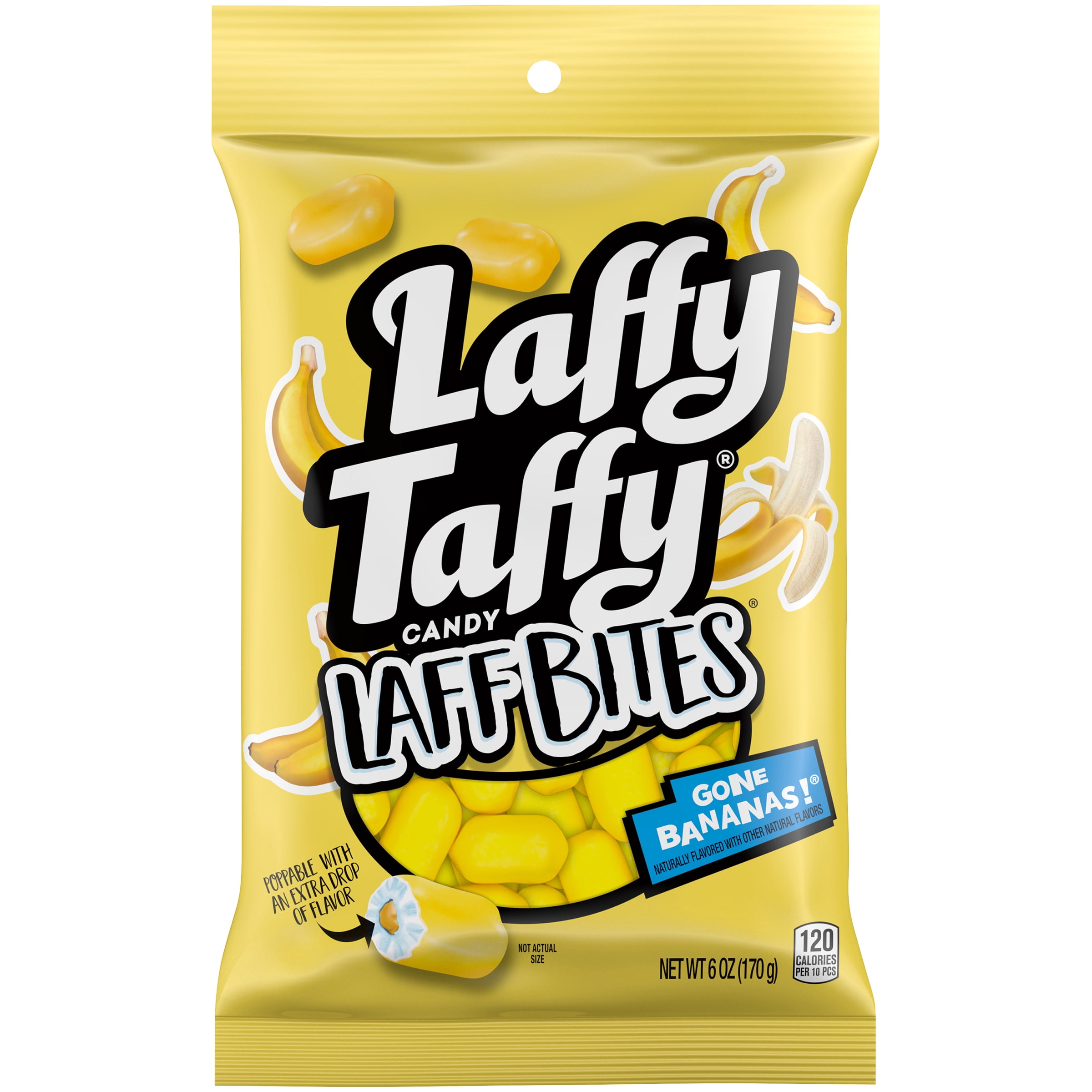 Poppable Laffy Taffy with an extra flavor drop inside wrapped in a hard, candy shell in the classic Laffy Taffy banana flavor. Laff Bites are chewy and poppable candy with a nextra drop of flavor in every bite. Includes a classic Laffy Taffy joke on every wrapper.