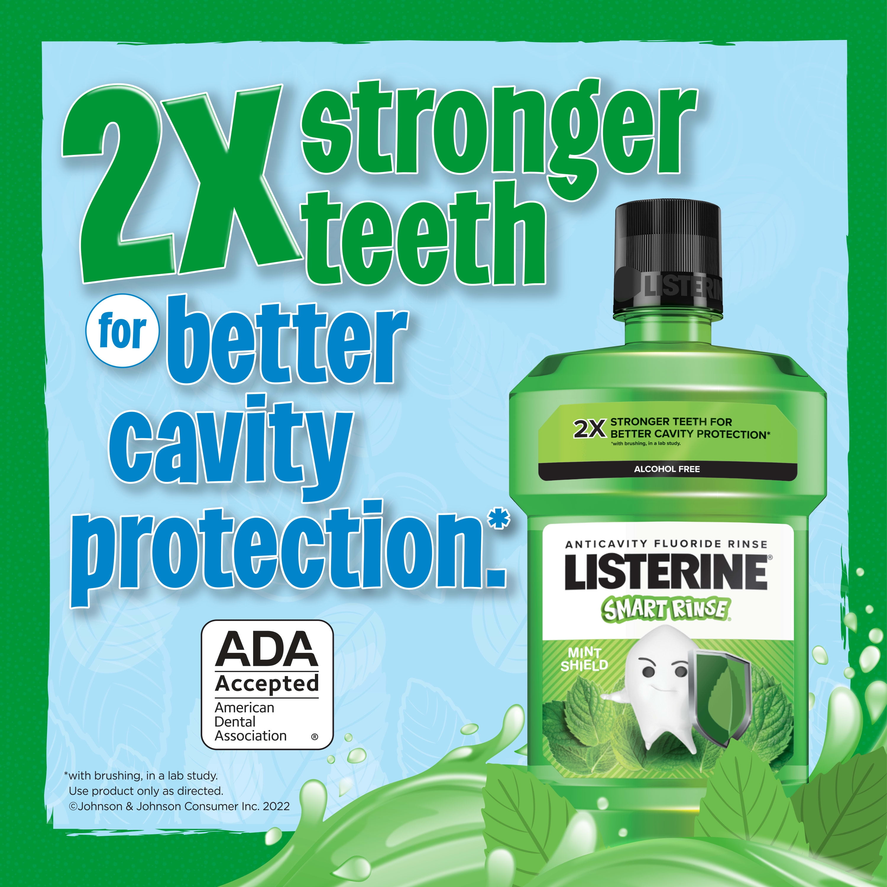 Help protect and strengthen your child’s teeth with Listerine Smart Rinse Mint Shield Kids Anticavity Mouthwash. For children six years and older, this ADA-accepted children’s mouthwash provides oral care for kids by helping strengthen teeth, cleaning the mouth beyond brushing alone, and preventing dental cavities – even in hard-to-reach places. In a lab study, this alcohol-free mouthwash with sodium fluoride and acidulated phosphate offered two times stronger teeth for better cavity protection with brushing. The kids’ oral rinse also freshens breath and tints food particles and debris so kids can see immediate proof in the sink of a cleaner mouth. To encourage good daily oral hygiene habits, the anticavity mouthwash has a fun Mint Shield flavor designed for kids. To use, vigorously rinse with two teaspoons of the kids mouthwash for one minute twice a day.