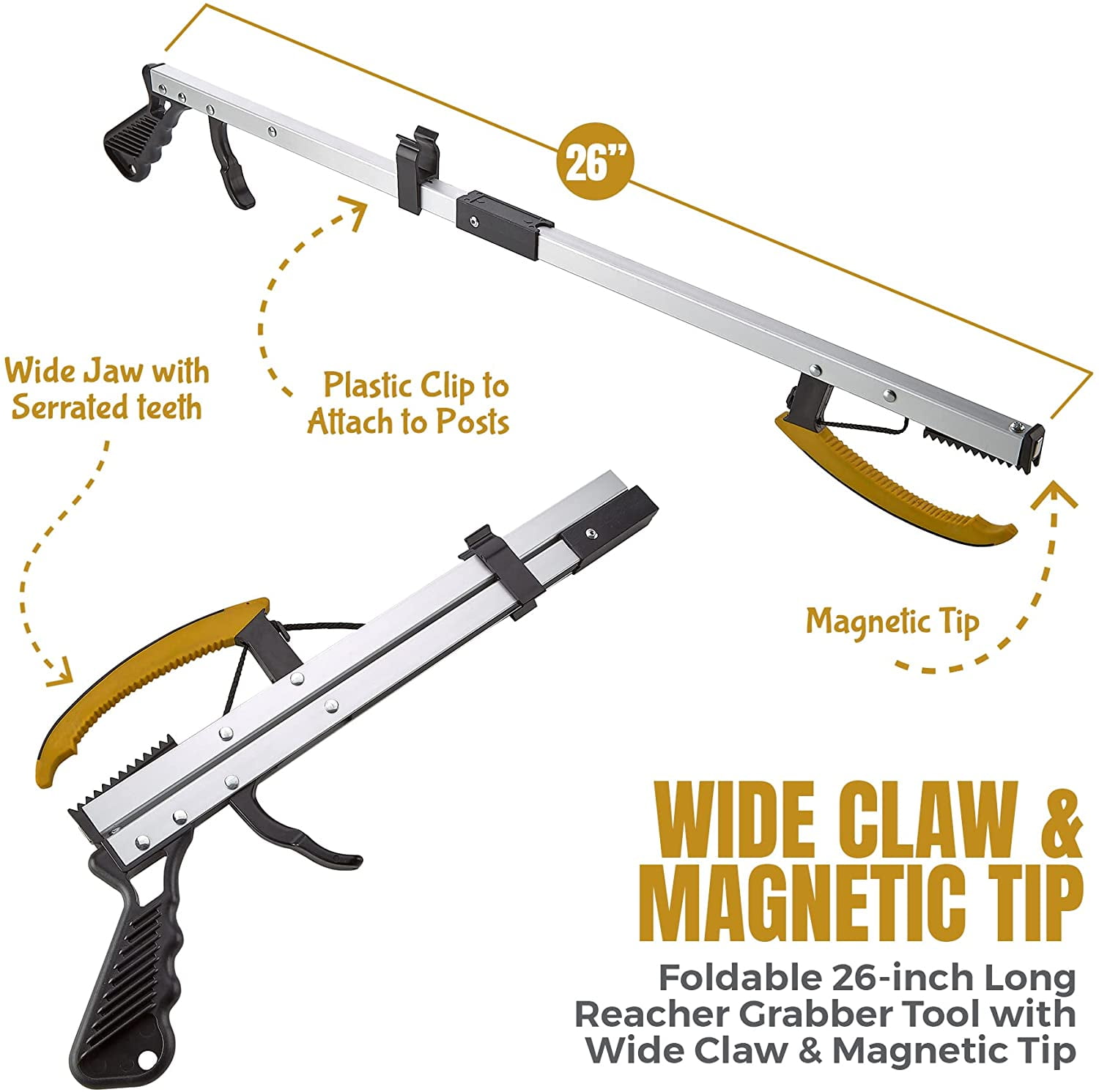 - STURDY & DURABLE CONSTRUCTION: Crafted from lightweight aluminum and sturdy plastic, our grabber tool is corrosion resistant and is suitable for indoor or outdoor use. The yellow clip fastens your grabber tool to canes, walkers, mobility aids and wheelchairs. The opposite side features a metal post perfect for picking up clothing or using as a convenient dressing aid