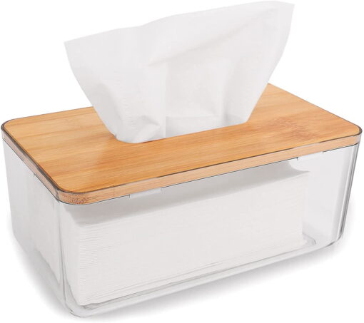 Minimalist Tissue Box Holder Rectangular with Bamboo Lid, Clear Dryer Sheet Holder Dispenser for Bathroom Vanity Counter top, Laundry Room, Living Room, Kitchen TCJJ