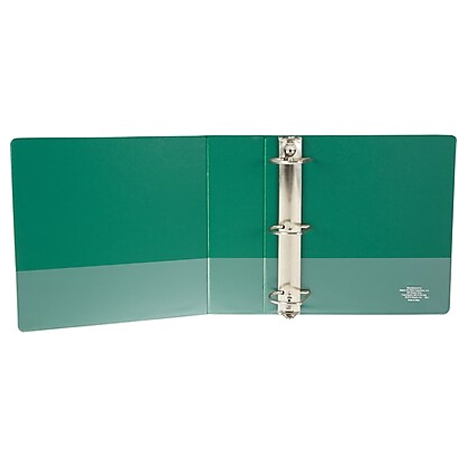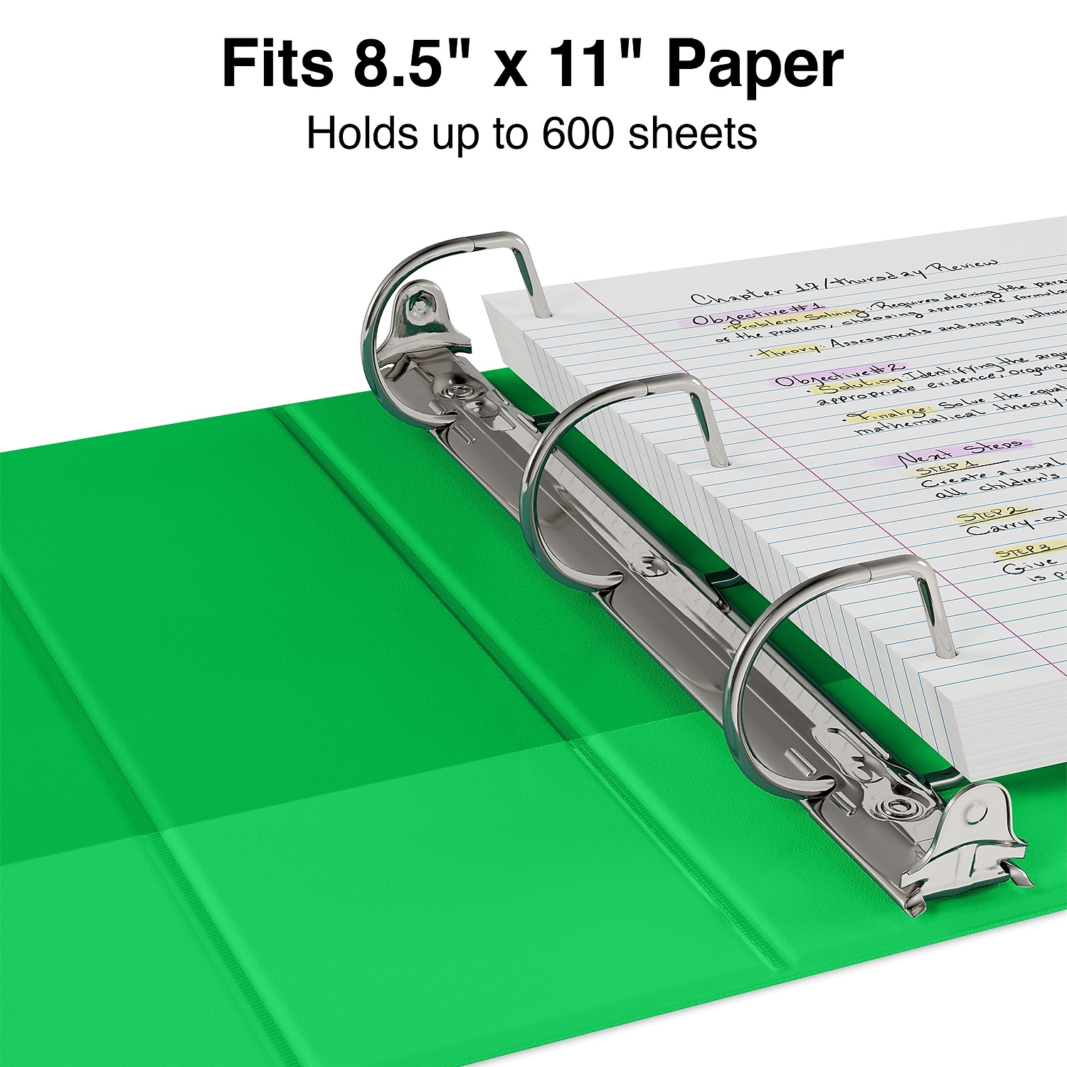 Keep paperwork easy to access on office shelves with this green D-ring 3?-inch 650-sheet standard binder. File away reports, forms and notes in this standard binder. The D-rings close without gaps to prevent pages from falling out, while the 650-sheet capacity accommodates bulk stacks of documents. Nonstick PVC-free construction keeps ink and toner from transferring, so your paperwork remains neat and easy to read. Featuring wider front and back panels, this standard binder protects your pages from accidental rips, tears and spills. Green view binder is an excellent choice for storing spreadsheets and other wide papers. Three D-Rings keep pages secure. Holds up to 600 sheets for maximized storage. Wide design accommodates letter-sized papers. Durable covers are made of plastic with nonstick surface. Three pockets for organization. Insert a custom spine label for easy identification of the contents. Large CapacityCleverly-constructed, this binder features 3-inch D rings for optimal versatility. It holds an average total of 600 standard letter-size sheets, offering enough storage to replace multiple binders or accommodate large projects or longer training manuals.ProtectiveThis 3-inch D-ring binder offers ample protection for the papers and important documents stored within. It’s built with wide front and rear panels to keep every document edge covered completely, including page protectors and dividers. It’s made of PVC-free plastic that’s nonstick and won’t pull or smudge ink or toner from stored pages. ConvenientFeaturing gap-free, back-mounted D rings, this 3-inch D-ring binder is designed to let pages lie flat and provide smooth page turns to maximize user enjoyment. It also offers two interior pockets that are ideal for storing loose pages for easier access. Green view binder is an excellent choice for storing spreadsheets and other wide papers. Three D-Rings keep pages secure. Holds up to 600 sheets for maximized storage. Wide design accommodates…