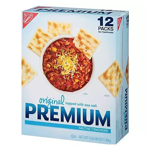 Nabisco Premium Saltine Crackers 12 Pack 4 ounces. Nabisco Premium Salted Saltine Crackers are topped with sea salt and are great with soups, chili and oysters. Topped with sea salt great with soups, chili and oysters. Kosher dairy, cracker tube, wrapped crackers, low salt crackers, grocery, variety pack crack.