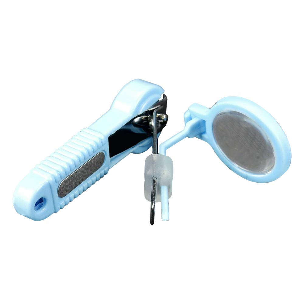Handy nail clipping system for close-up and delicate trimming. Sturdy metal nail clipper fits snugly into the plastic holders. Magnifying lens (included) installs quickly into the clipper handle. The lens is fully adjustable for perfect viewing on nails. The holder features a removable cup to catch clippings. Comes completely apart for thorough cleaning. Excellent tool for babies, toddlers, and senior citizens. Overall measurements 2 1/2"L x 1"W x 2 3/4"H (opened for use). Folds compact to fit in box 3"L x 1.5"W x 1"H (box included). such as Glass