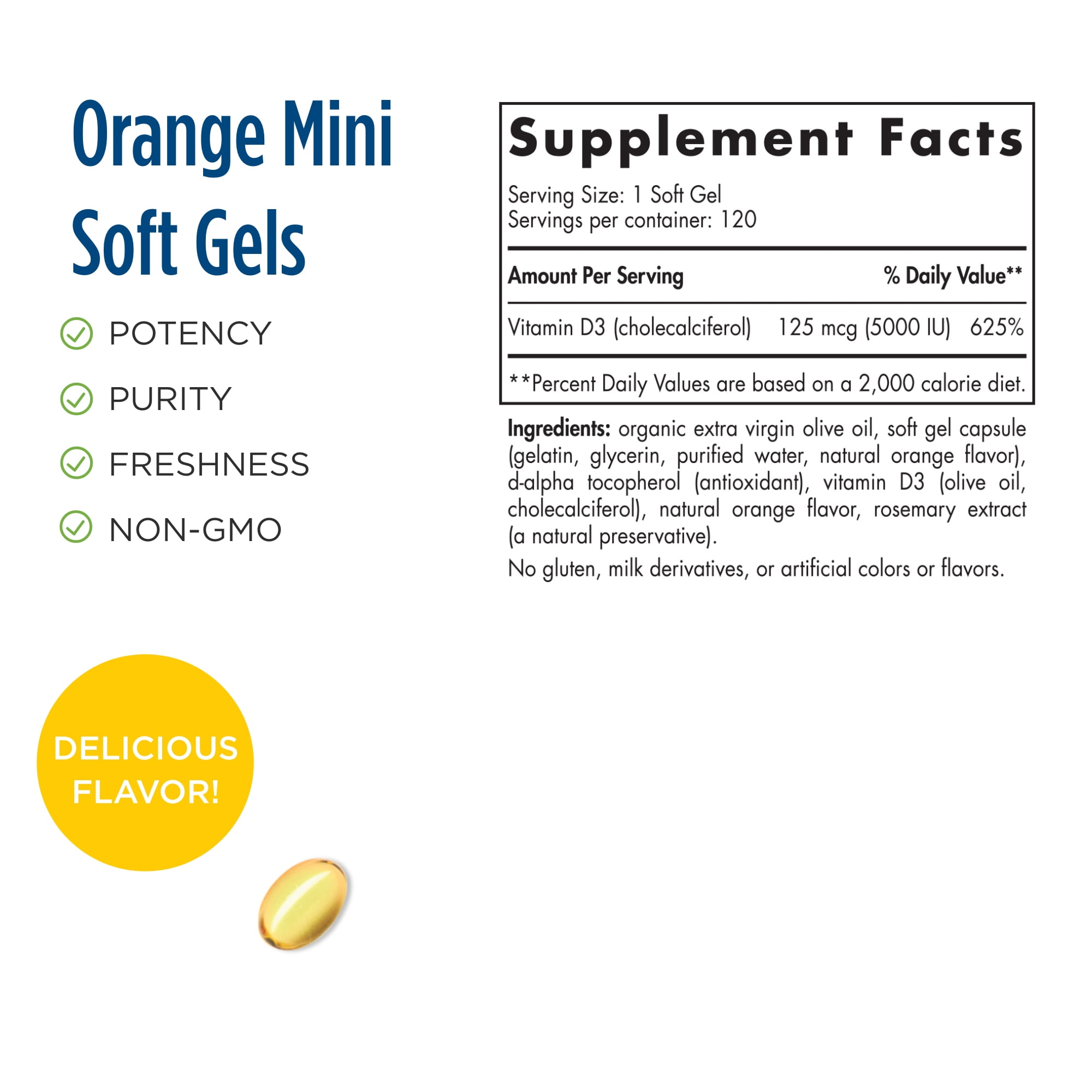 - 125 mcg (5,000 IU) Vitamin D3