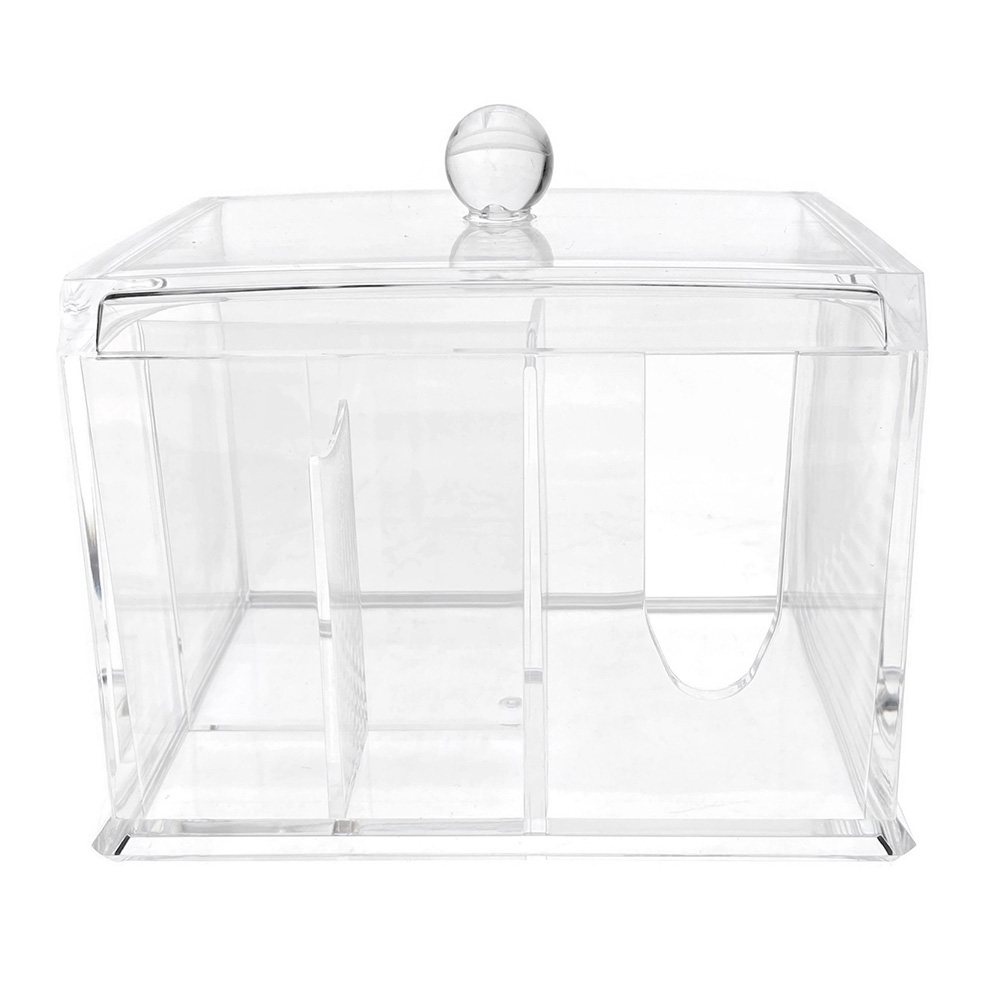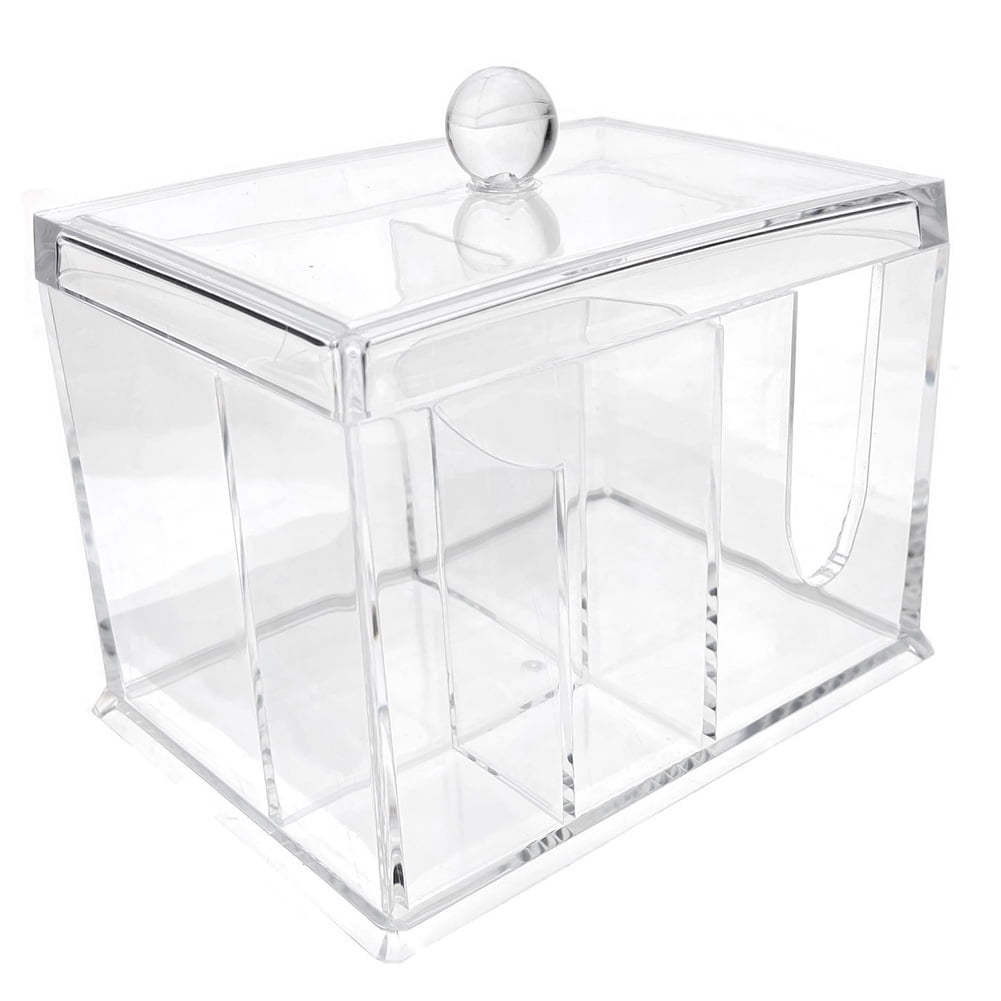 The OnDisplay Acrylic Cotton Swab/Pad Cosmetics Organizer neatly stores cosmetics, cotton swabs, pads and cotton balls in your bathroom in one simple and awesome design. Constructed of heavy duty molded clear acrylic, this organizer measures about 5.8" x 4.3" x 5". Features a large open bin with 3 smaller sections to separate all of your bathroom accessories. Stays moisture free with the matching acrylic lid to protect its contents. Also perfect for use as a desktop accessory organizer..