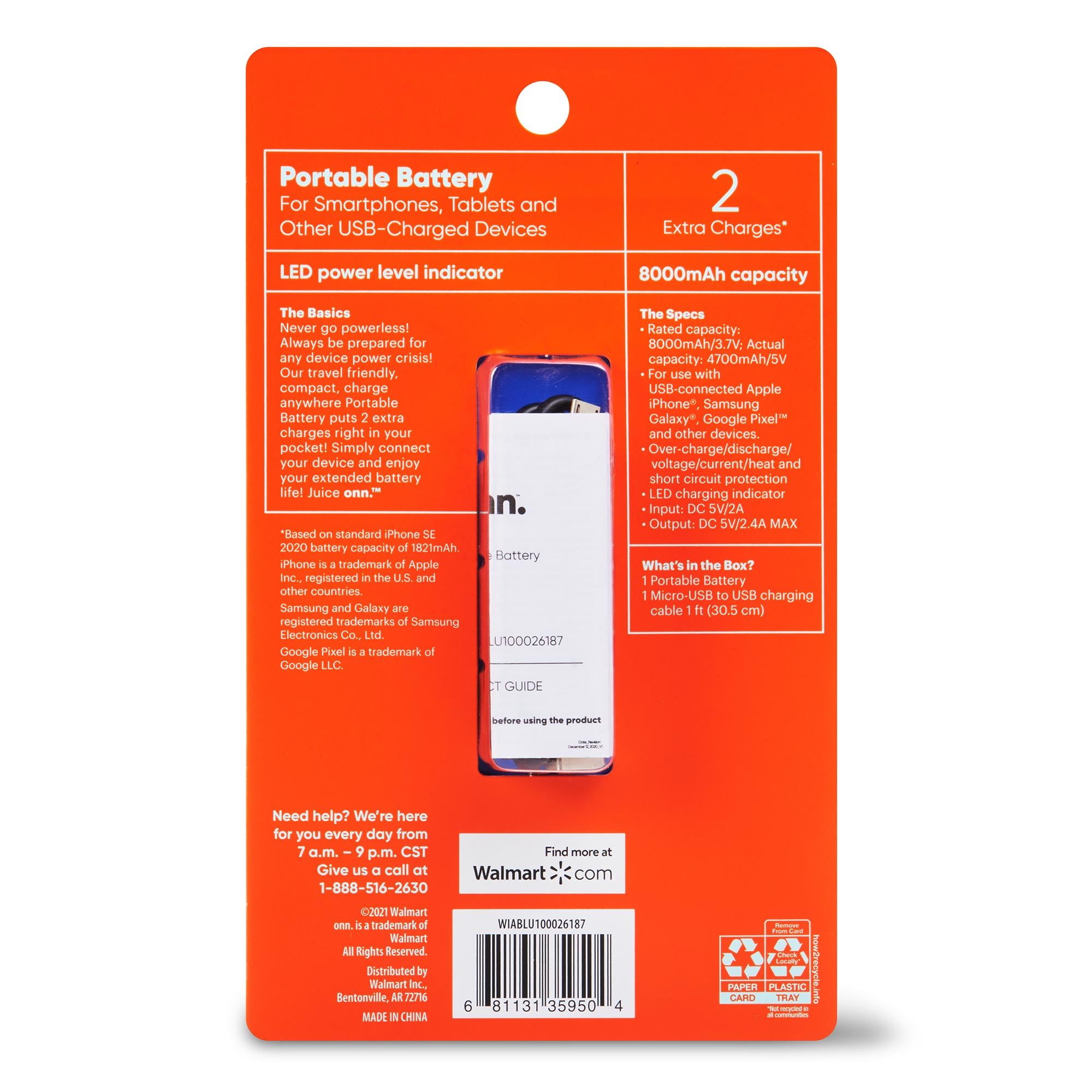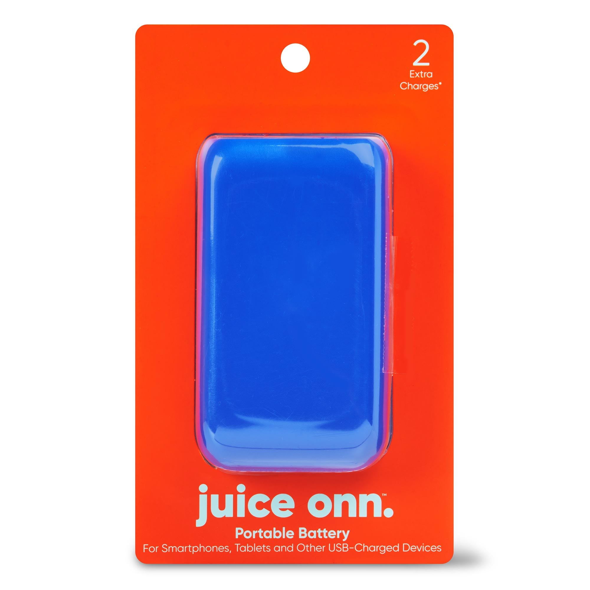 Always be prepared with our onn. Portable Battery. Our travel-friendly, compact, charge-anywhere portable battery puts two extra charges right in your pocket! Simply connect your device and enjoy your extended battery life! Juice onn. with our onn. Portable Battery.