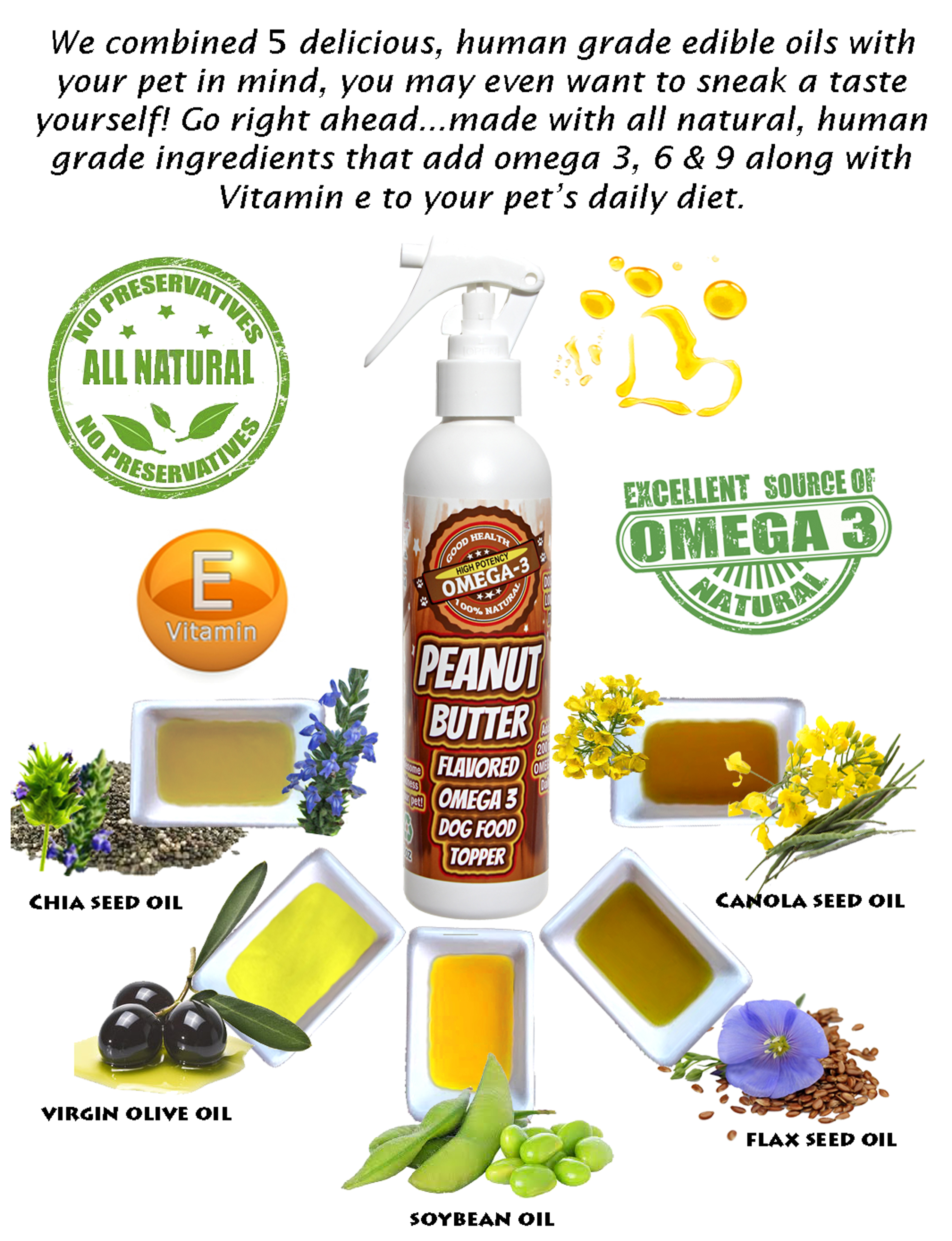 Flavored Omega 3 dog food toppers are delicious and holistic blends of all natural, human grade, edible oils and natural flavorings that dogs love. Made with human grade edible oils, no artificial ingredients or preservatives. Made in the USA. Flavored sprays can be applied to dry or wet dog food to enhance the aroma and flavor. Flavored sprays add Omega 3 to every meal which has been demonstrated to support healthy skin and coat. Great for picky eaters. Will not turn dry dog food mushy or soggy. No refrigeration necessary. Delicious and nutritious, makes every meal a dog treat. Made with Virgin olive oil, canola seed oil, soybean oil, flax seed oil and chia seed oil along with human grade flavorings. Does not contain any protein or salt. One 8 oz bottle will last 3 months with 2 meals per day and 3-4 sprays per meal. No cholesterol, no Trans fats, gluten free, no artificial sweeteners, no artificial colors or dyes, no artificial preservatives or thickeners added. 100% pure, human grade, plant seed oils combined with natural flavorings! Two servings a day will provide your dog with 200 mg of Omega 3 essential fatty acids and 5 IU of Vitamin E. Flavored Sprays are also great for dry skin problems or dog eczema due to the high level of ALA Omega 3 fatty acids.