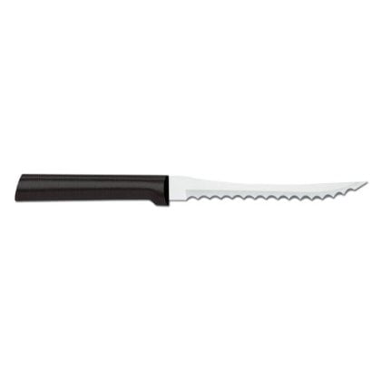 A top-seller in Radas lineup of great knives, the world-famous Tomato Slicer features our dual-serrated blade that allows you to effortlessly cut perfect tomato slicesthick or thinwithout squashing. It goes way beyond tomatoes though. Use it to cut through crusty rolls then make flawless pepper rings, cucumber rounds, and onion slices for sandwiches. It will be one of the most-usedand most-lovedknives in your kitchen.About Rada Cutlery:Formed from humble beginnings in 1948, Rada Cutlery is a family-owned business in Waverly, Iowa that has created lasting quality ever since. Founded with the mindset of helping others, Rada is incredibly proud to offer a superb fundraising program that helps more than 12,000 groups per year raise money for many great causes. Today, they continue to bring the same made-in-the- quality in all kinds of products from outstanding knives to commercial-grade pans with superior craftsmanship and backed by a lifetime guarantee. Even some of the original silver handles knives like their Paring, Steak/Utility, and Slicer are still in production.Rada Cutlery Tomato Slicer (Black) Features:Made from T420 high-carbon stainless steelHolds maximum edge retentionStampedDual-serrated bladeSlices straight through tomatoes, citrus, peppers, and heads of lettuceBuilt with a black offset resin handle to protect knucklesIdeal for gifting at birthdays, holidays, anniversaries, or weddingsHand washing is recommendedBlade Length – 5"Overall length – 8.875"Lifetime warrantyInterested in Rada Cutlery? Find more here!