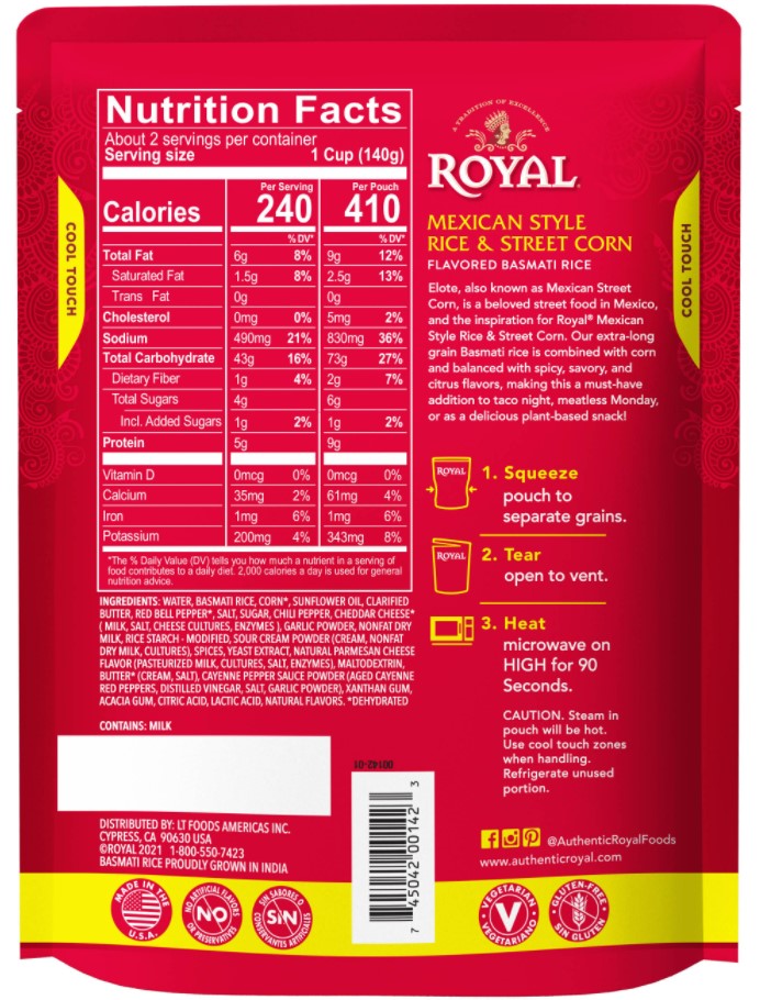 Royal Mexican Street Rice & Street Corn Flavored Ready to Heat Rice is inspired by elite, a beloved Street for in Mexico. Brought to you by Royal, ‘s #1 best-selling Basmati rice, our ready to heat rice brings you authentic flavors from around the world combined with the sweet aroma & long grain goodness of Basmati rice. Royal’s Mexican Style Rice & Sweet Corn seasoned rice combines our famous Basmati rice with corn and balanced with spicy, savory, and citrus flavors, making it a great addition to your table. Our ready to heat rice is easy to cook, it takes just 90 seconds from your kitchen to the table. All of our rice is vegan, Non-GMO, Gluten free, Kosher, Halal, and non-fat. At Royal, we are committed to bringing you the highest quality authentic Basmati rice and other grains from all around the world – without compromise or exception.