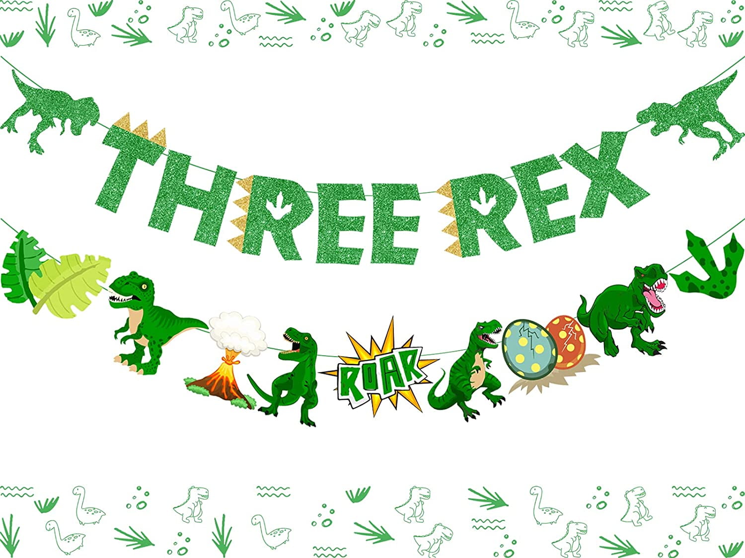 Three Rex Birthday Party Decorations-Green Glittery Three Rex Banner and Dinosaur Theme Garland 3rd Birthday Party Supplies for Boys Girls