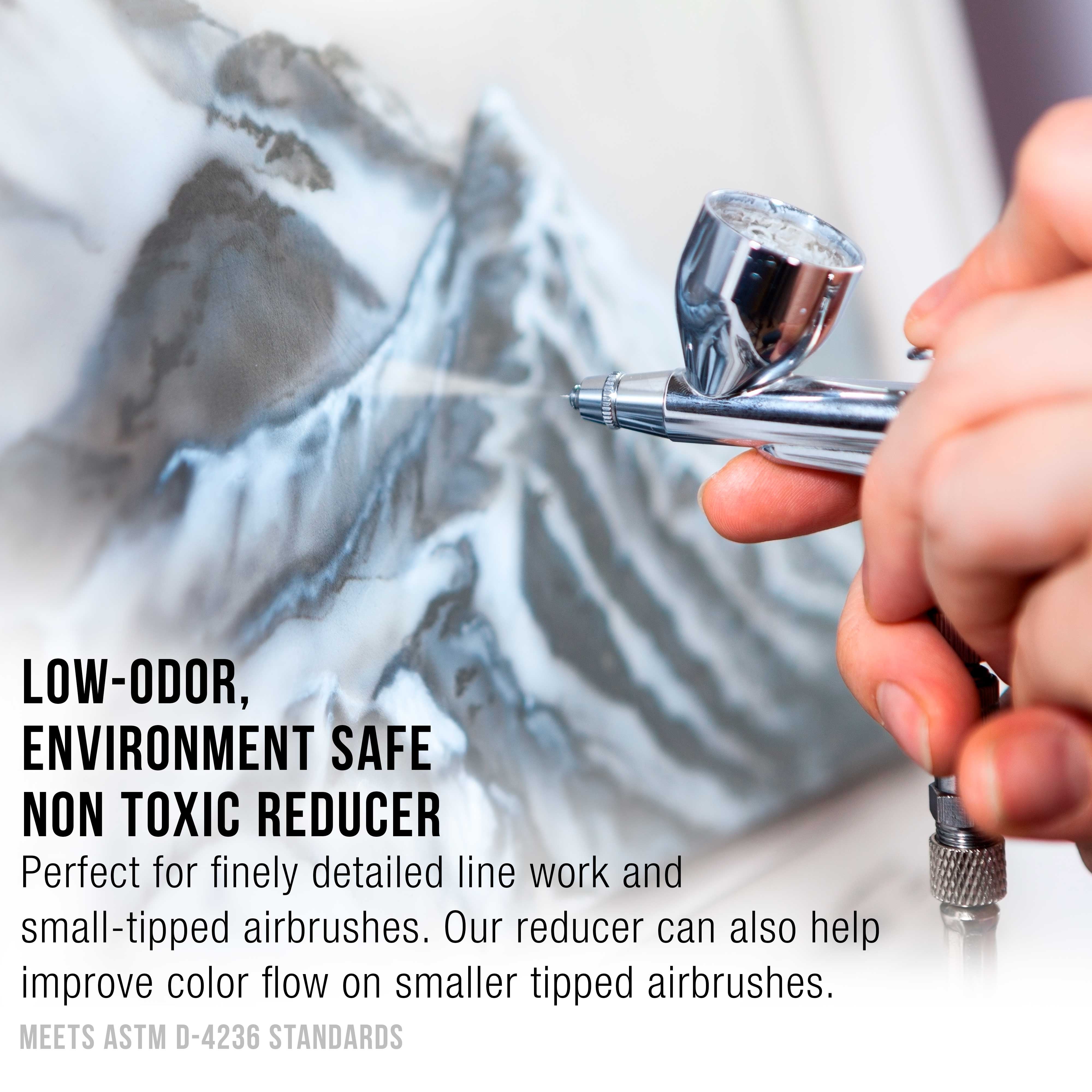 Airbrush Reducer & Extender BaseDesigned to make the airbrush colors thinner, increase color transparency and improve the color flow with smaller tipped airbrushes. Contains acrylic based binders to ensure that you do not lose any paint quality when reducing it further for any desired effect.
